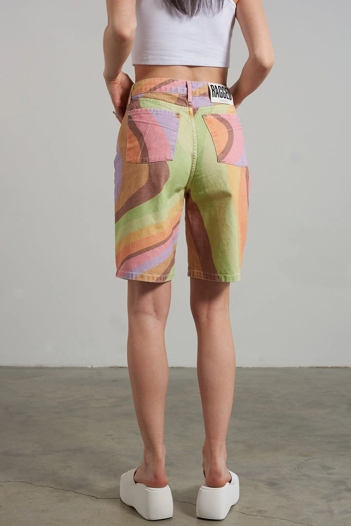 Ragged Jeans multi wave rainbow printed denim shorts.