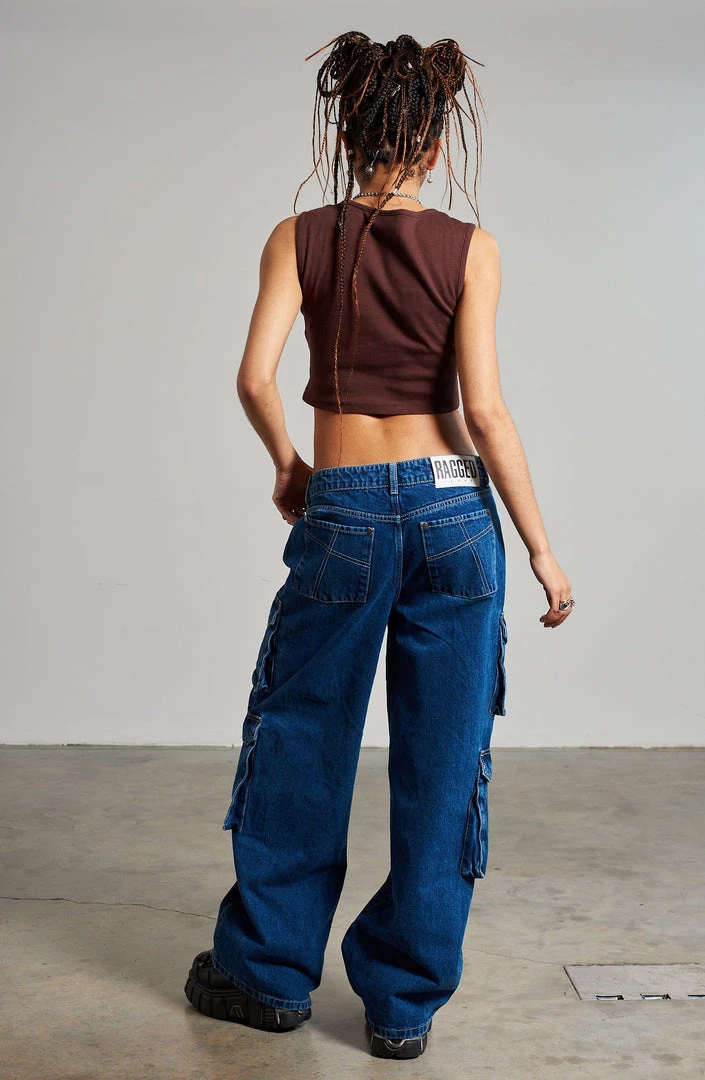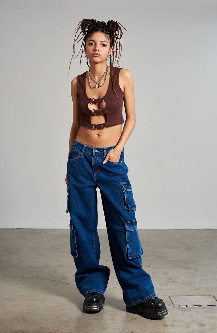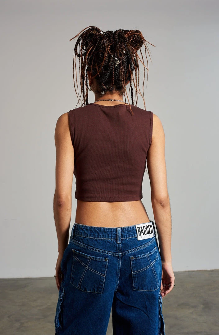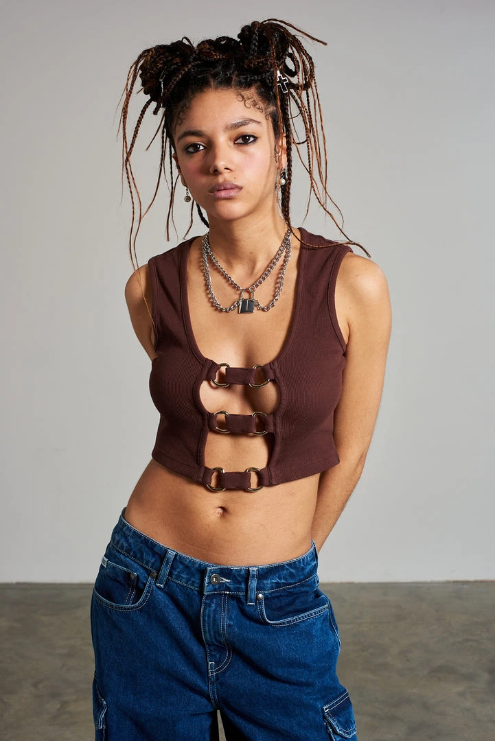 The Ragged Priest brown sleeveless ribbed top with d-ring and strap front detail.