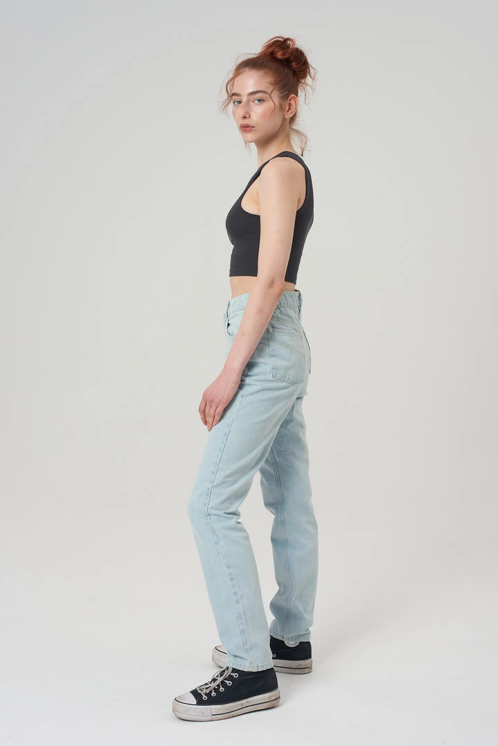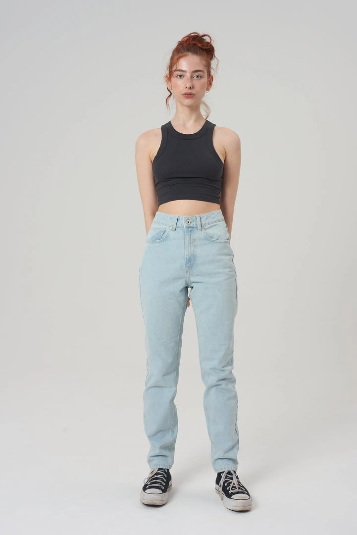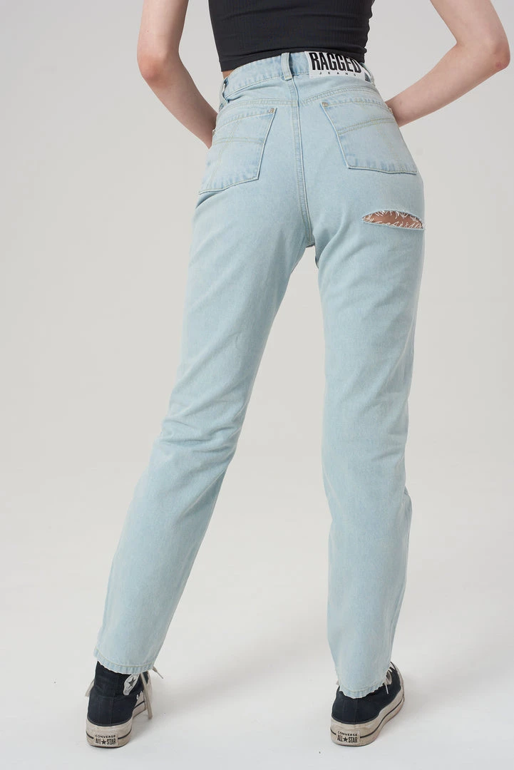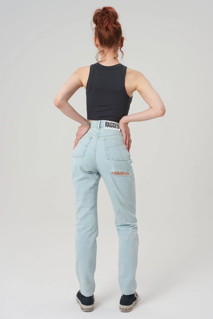 Give your booty the spotlight it deserves. Classic high waisted stonewash mom jeans with rip detail. Classic high waisted mom jean with rip detail. Complete with “RAGGED JEANS” back belt loop tab.Â