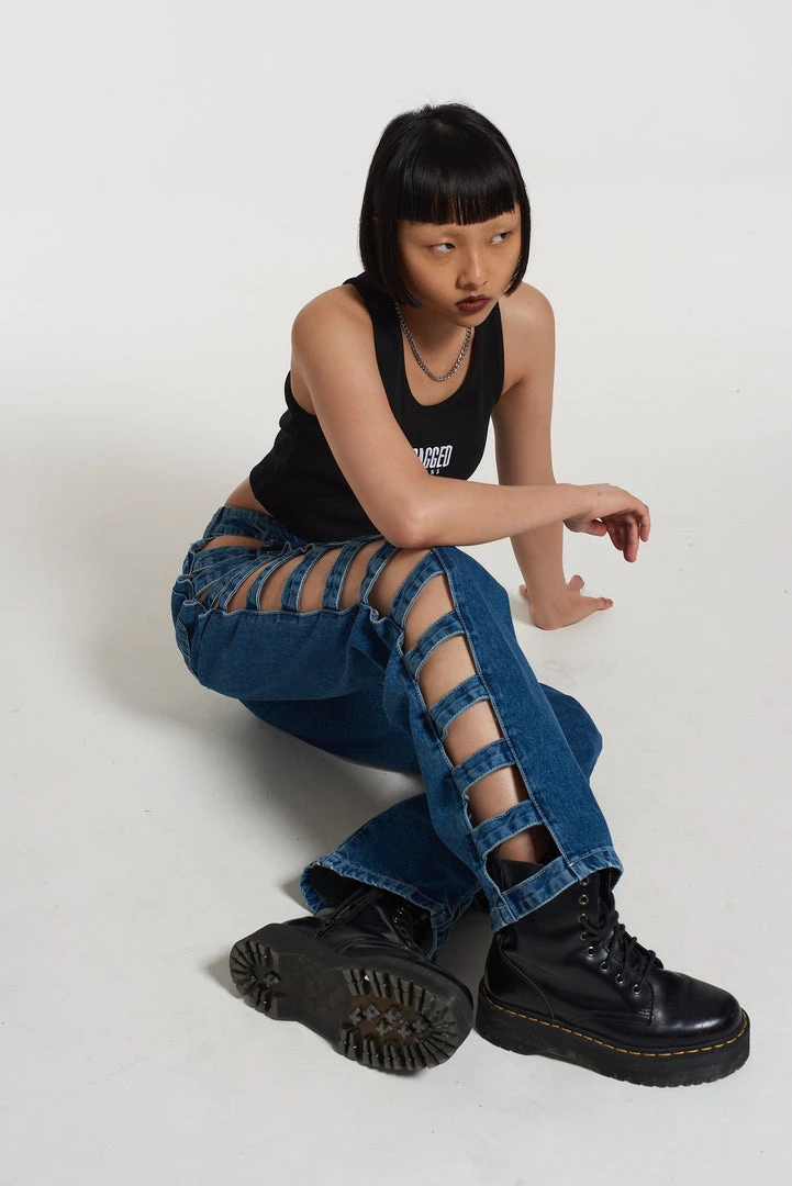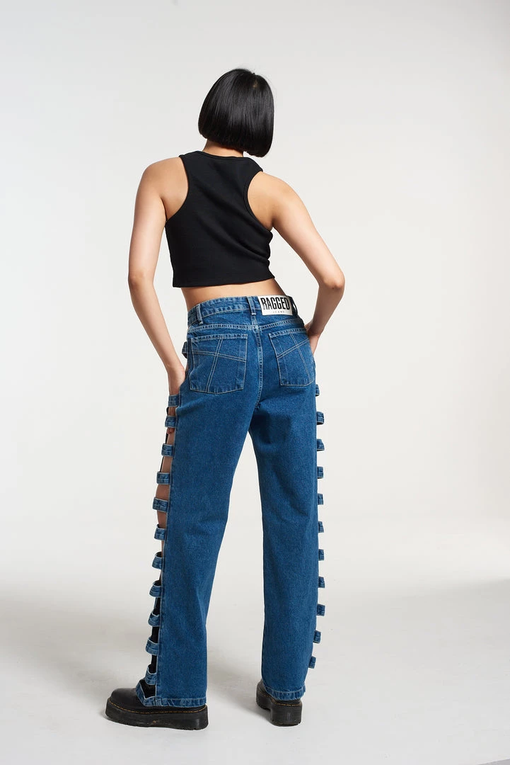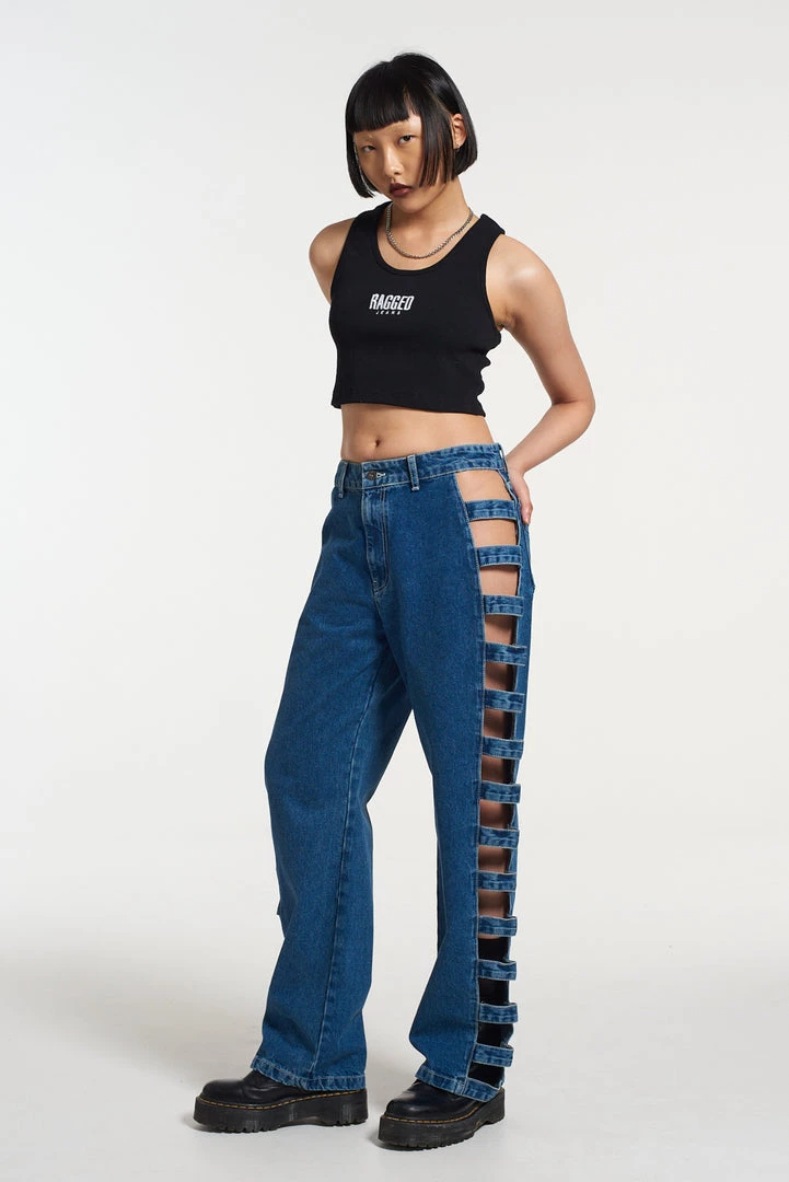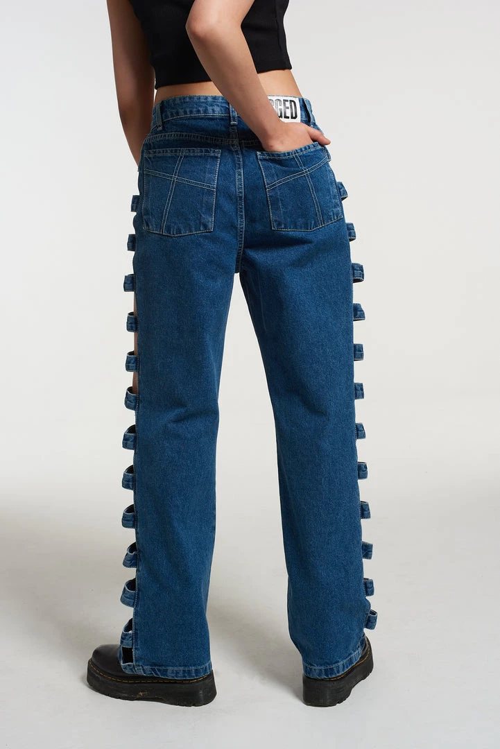 The Ragged Priest Cut out side seam detail jeans in our classic mid wash dad jean fit.