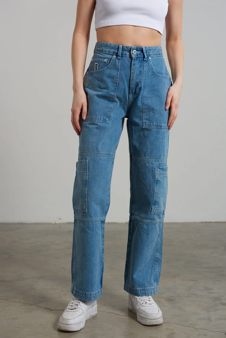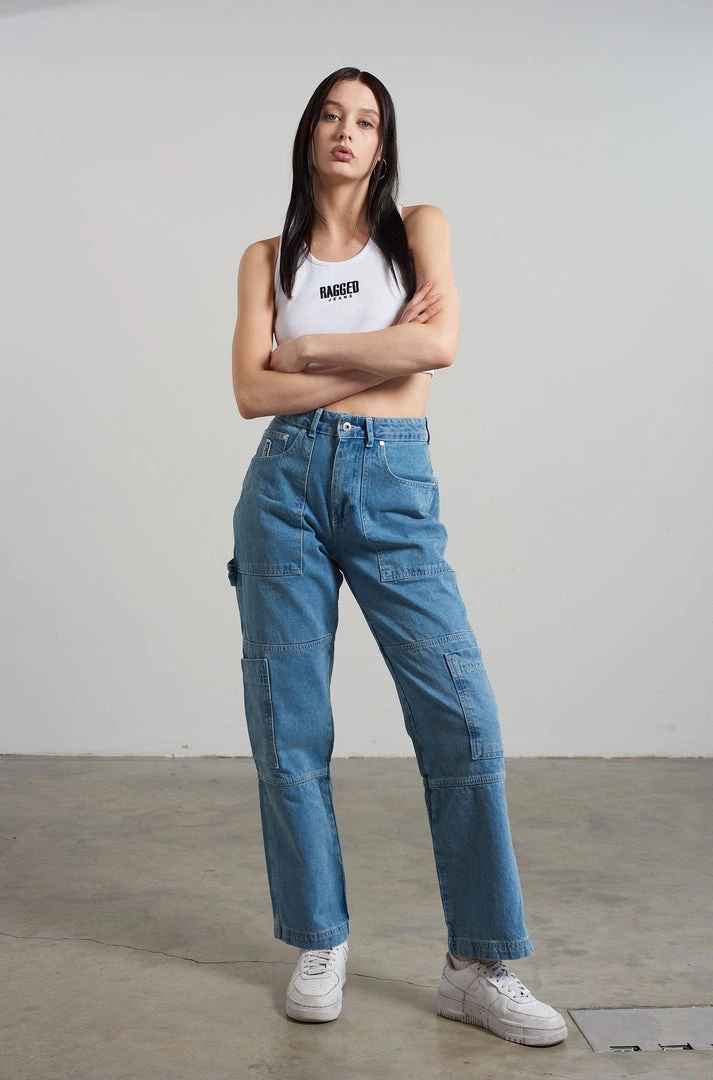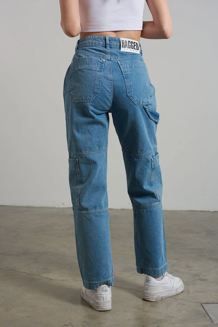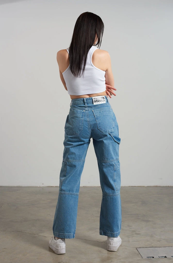 The Ragged Priest signature Combat Jean fit in our mid blue wash denim with classic “Ragged Jeans” belt loop back tab.