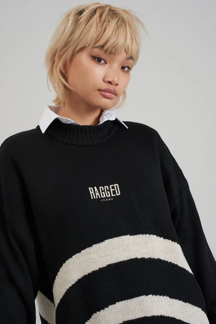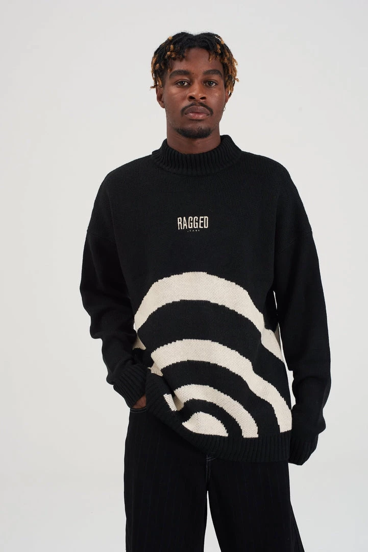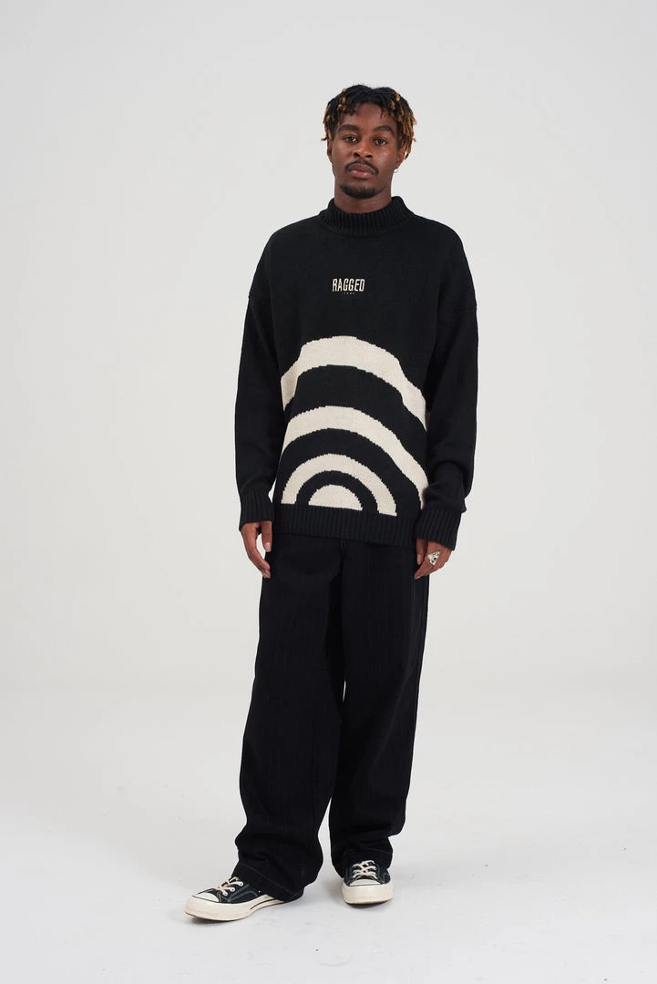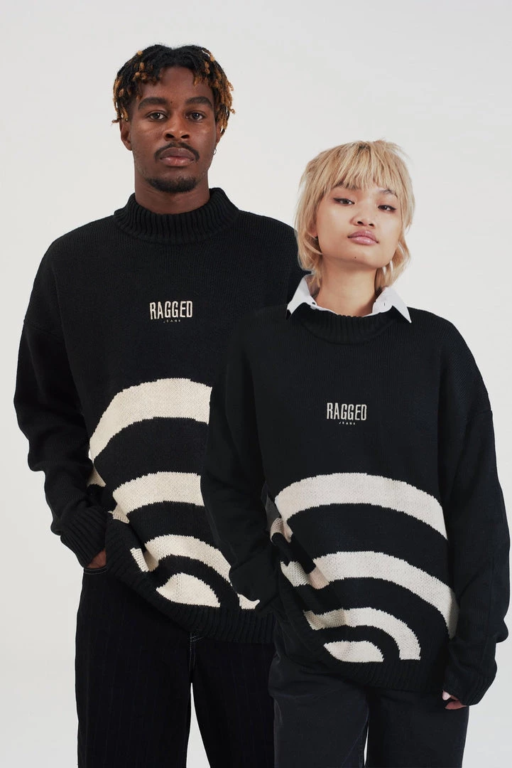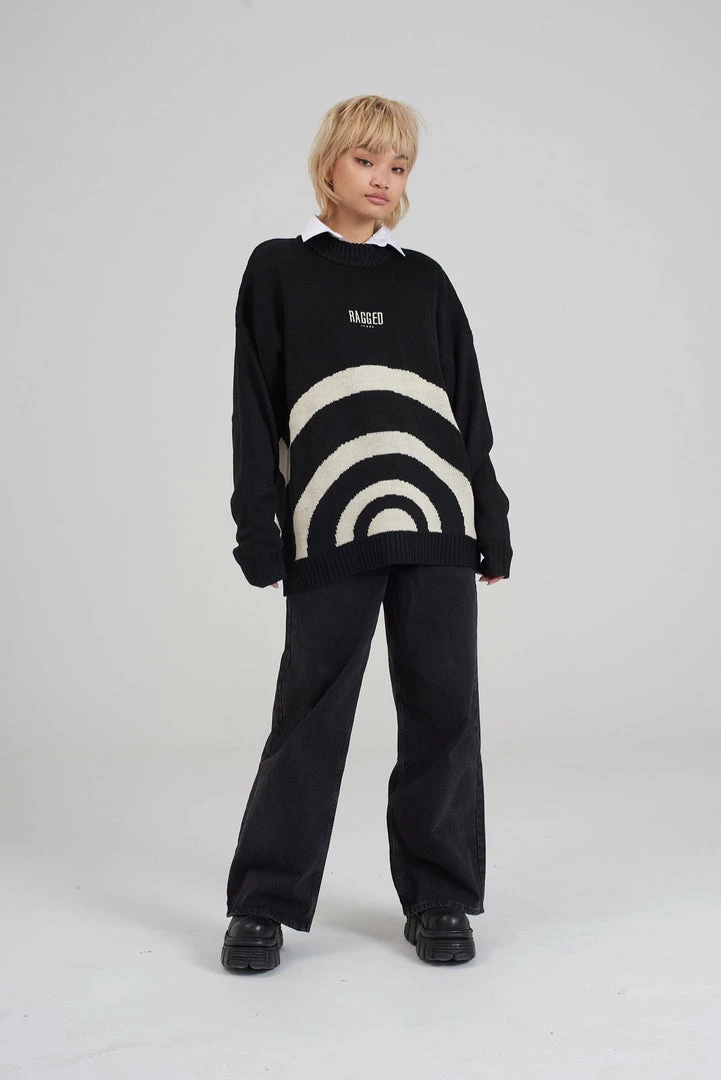 Ragged Jeans unisex black knit jumper with cream circle detail.