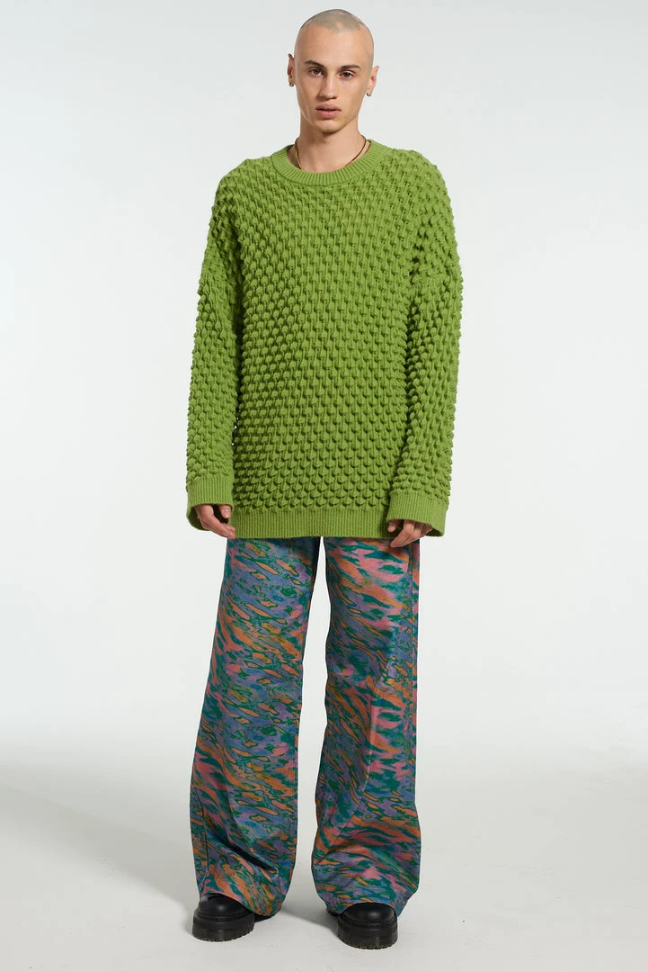 The Ragged Priest men’s wide leg jeans with graphic multi coloured water print design.