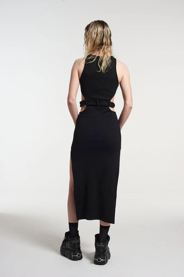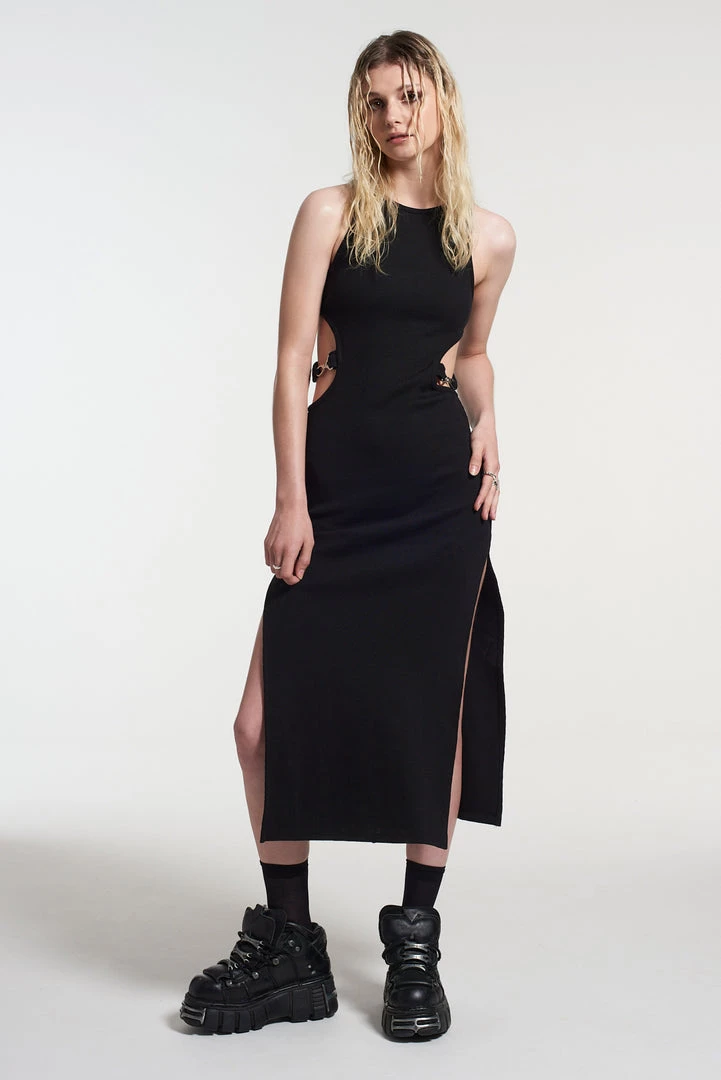 The Ragged Priest black ribbed maxi vest dress with side slits and cut out waist detail with trigger hook strap detail.
