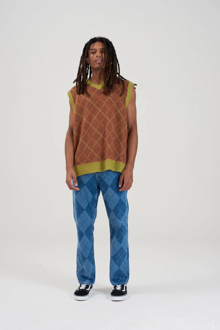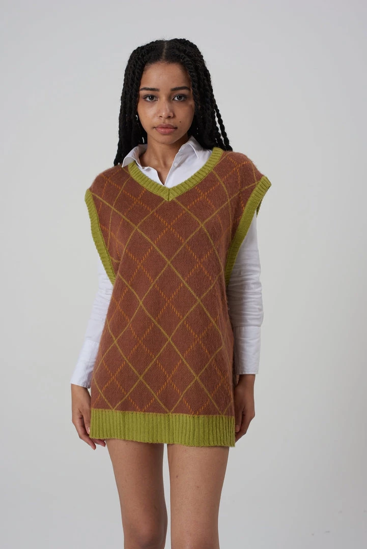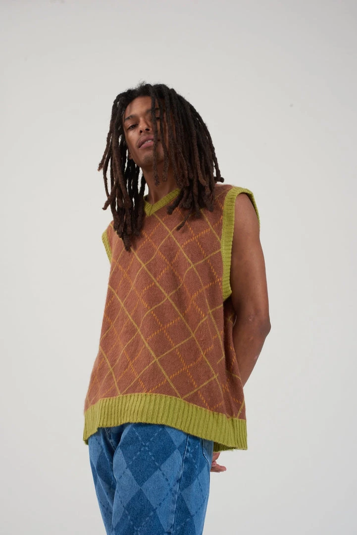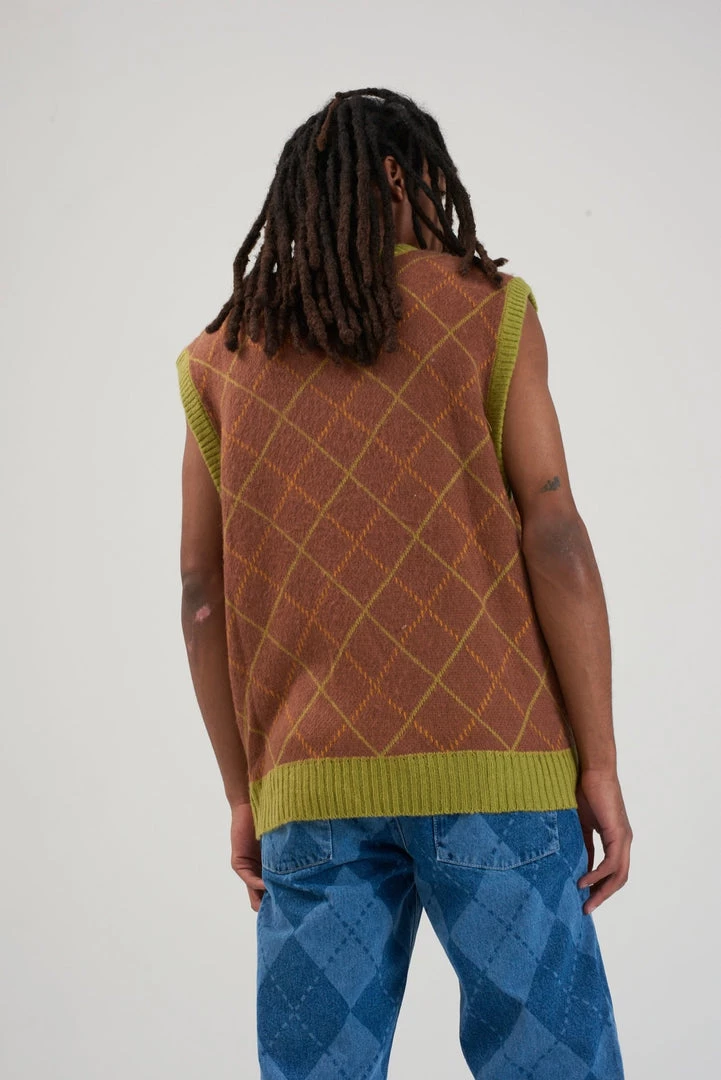 Ragged Jeans mens brown and green knitted v-neck vest.