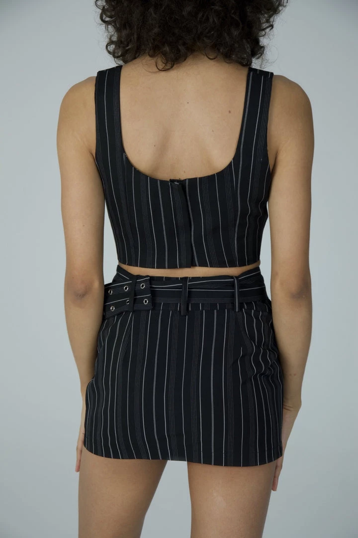 The Ragged Priest black pinstripe mini skirt with double eyelet buckle belt.
