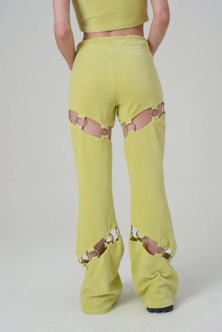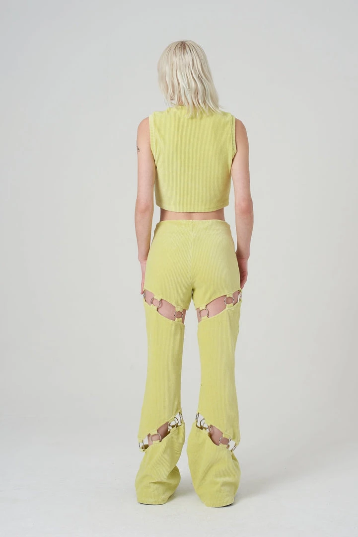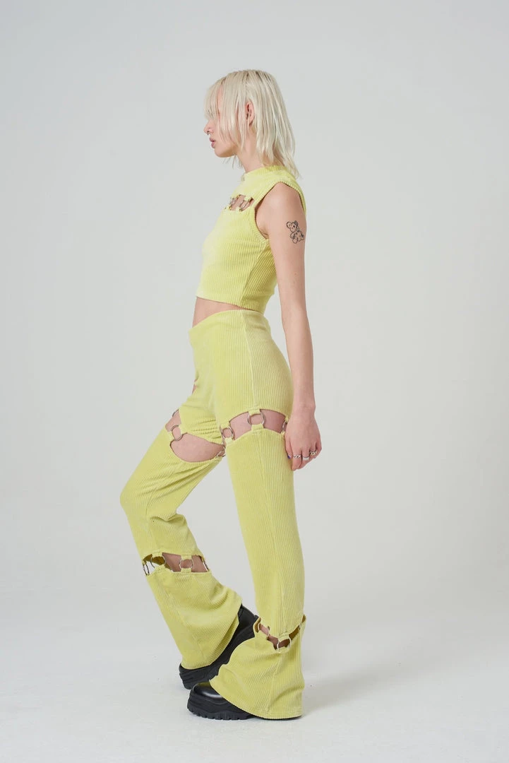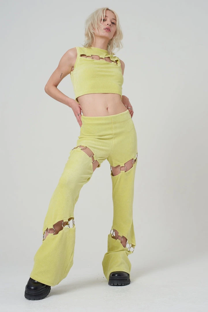 The Ragged Priest green velour pant with o-ring cut out detail.