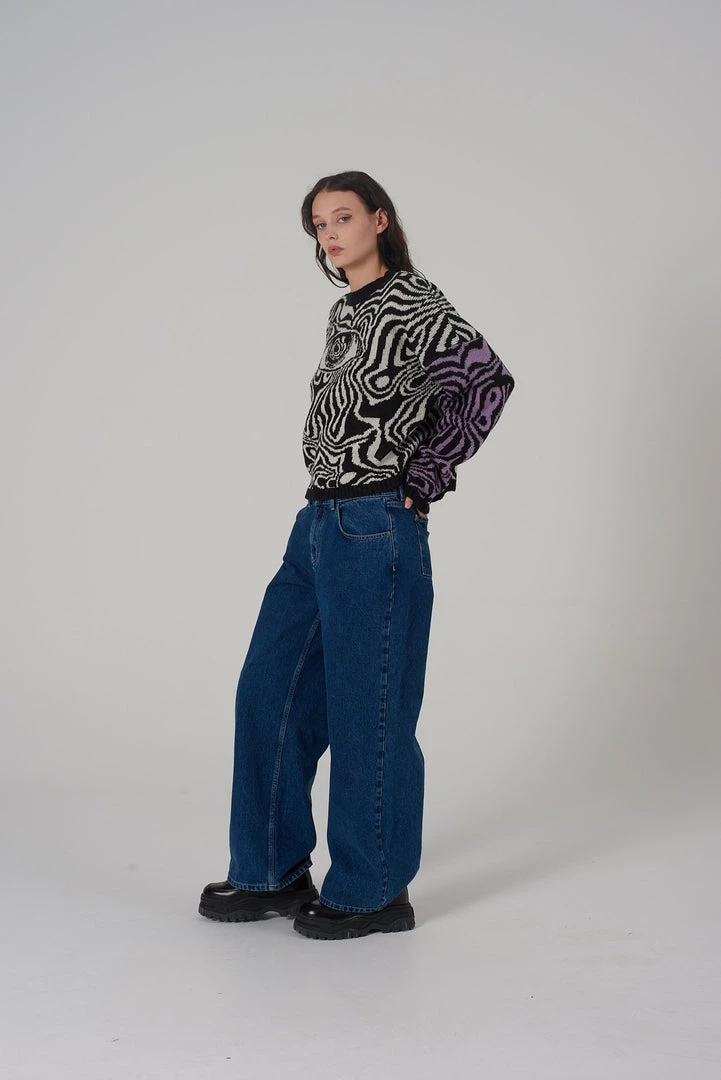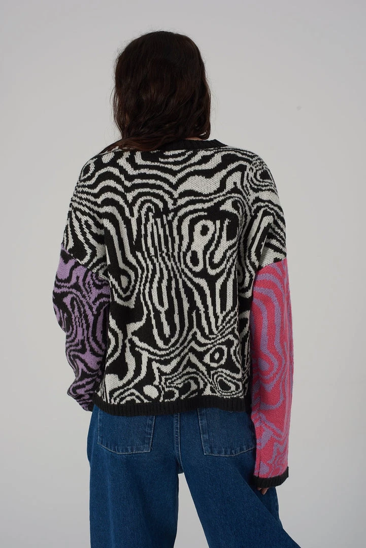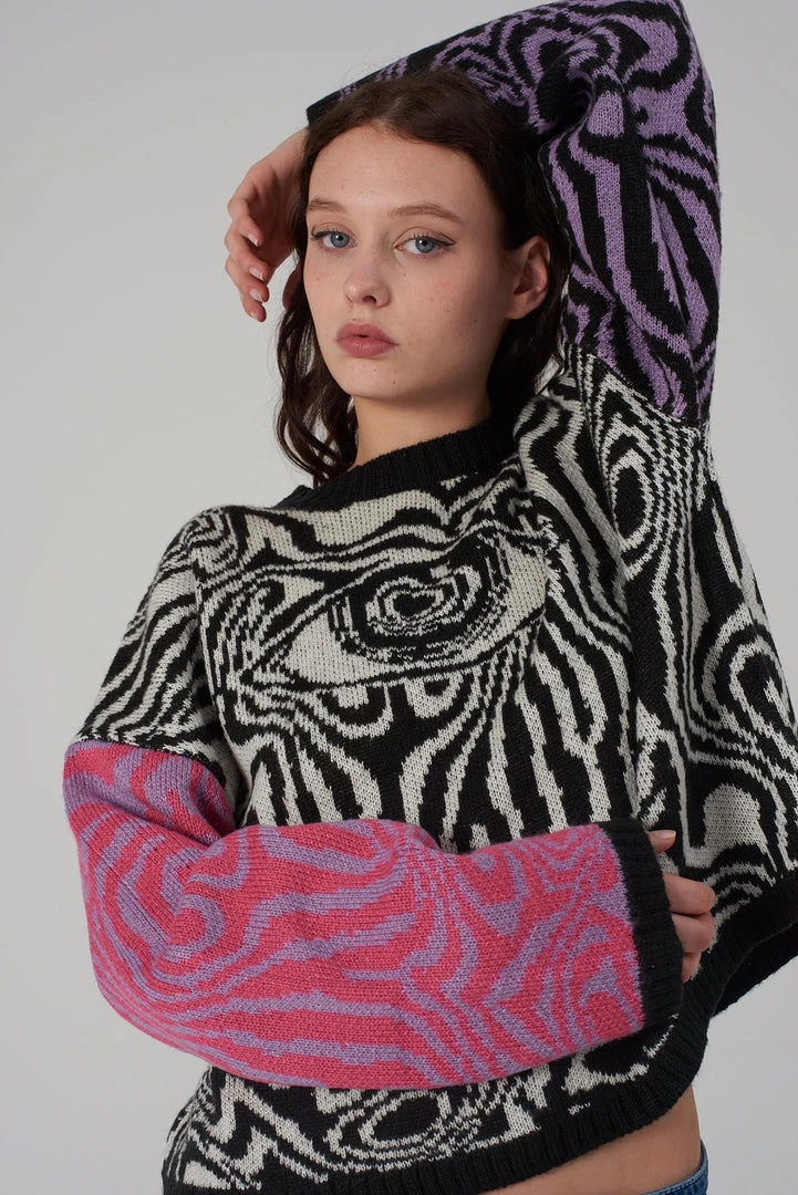 The Ragged Priest black & white marble pattern knitted jumper with eye graphic and contrast sleeves.