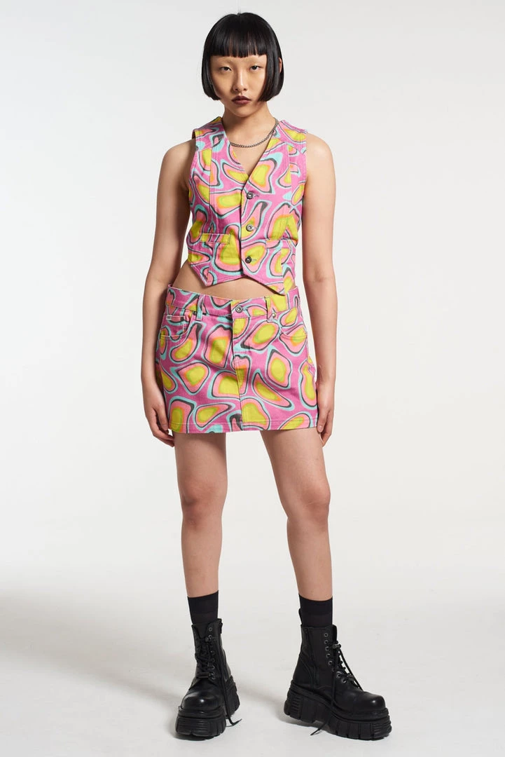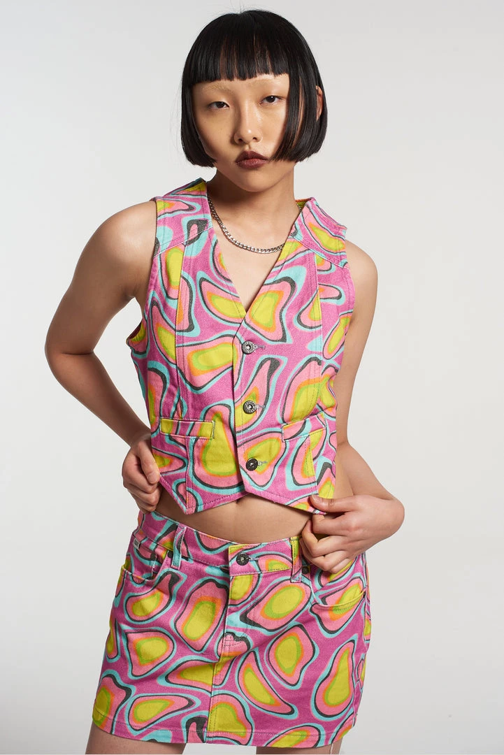 The Ragged Priest Karma printed waistcoat in pink, orange, yellow and blue.Â