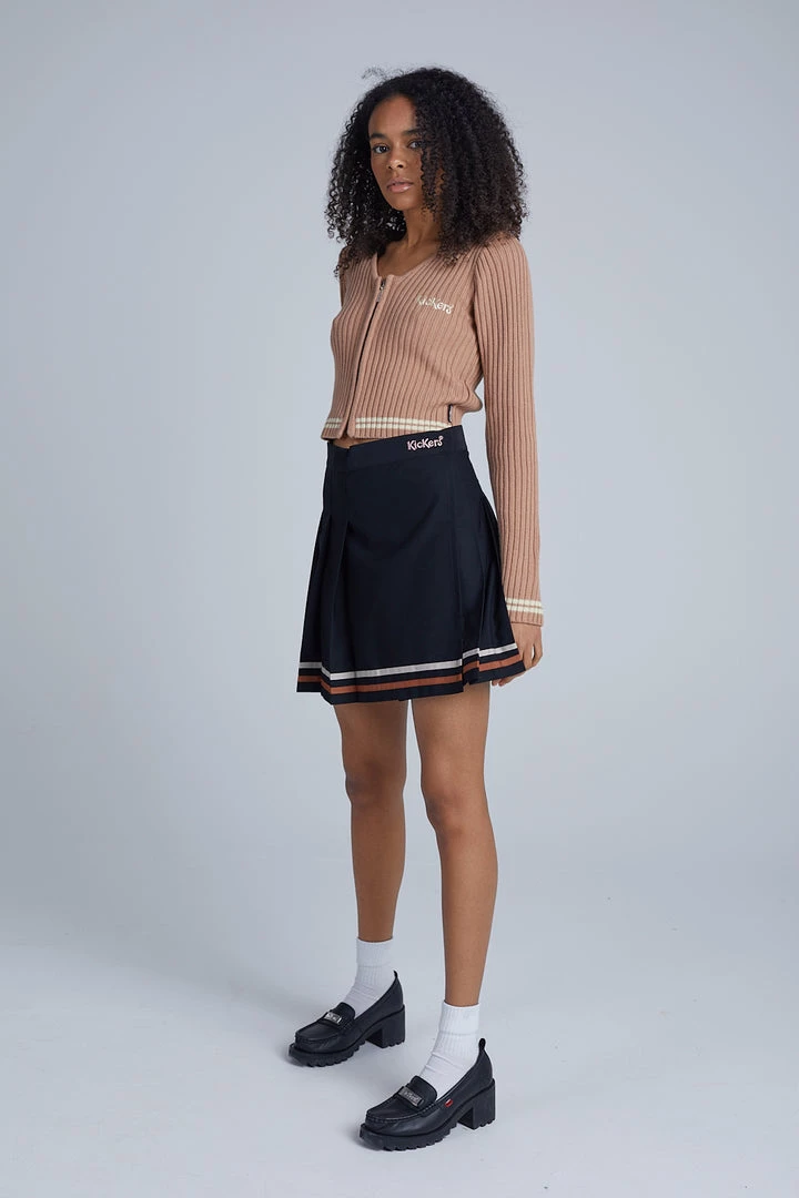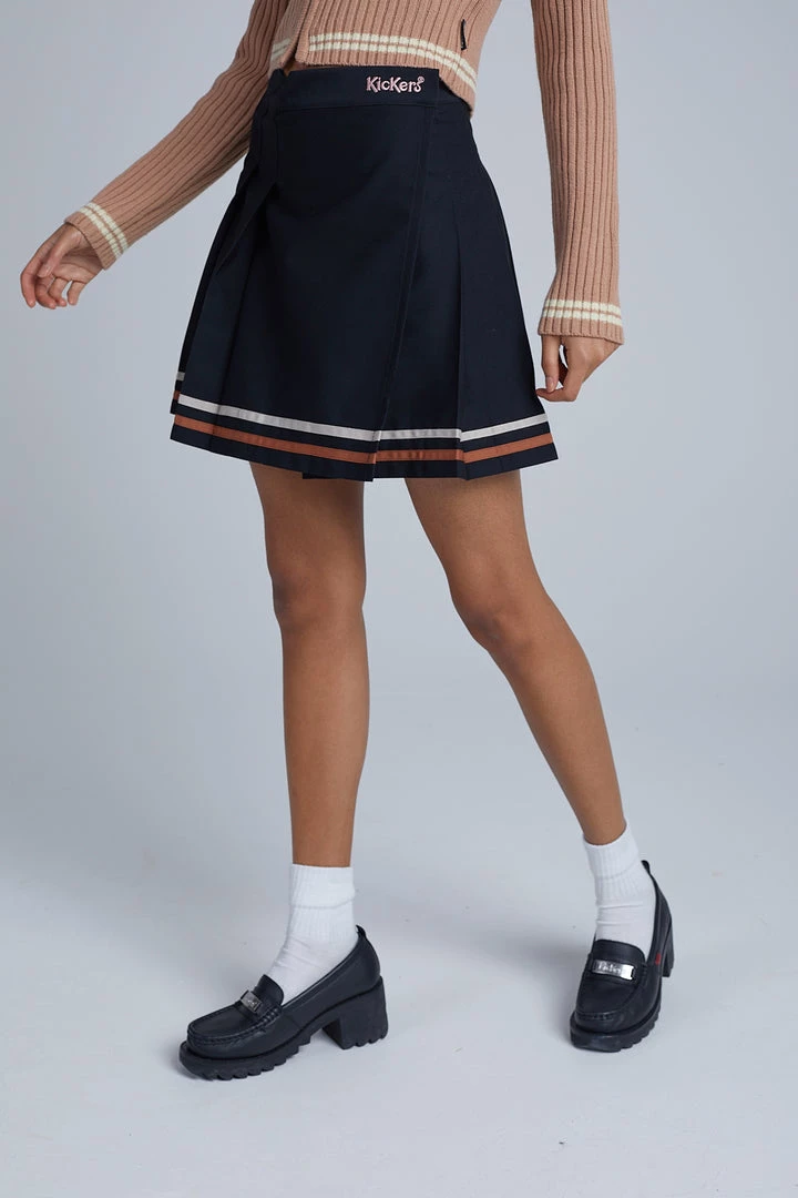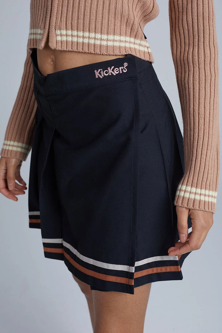 Kickers Classics black pleated mini skirt with pink and beige stripe trim.