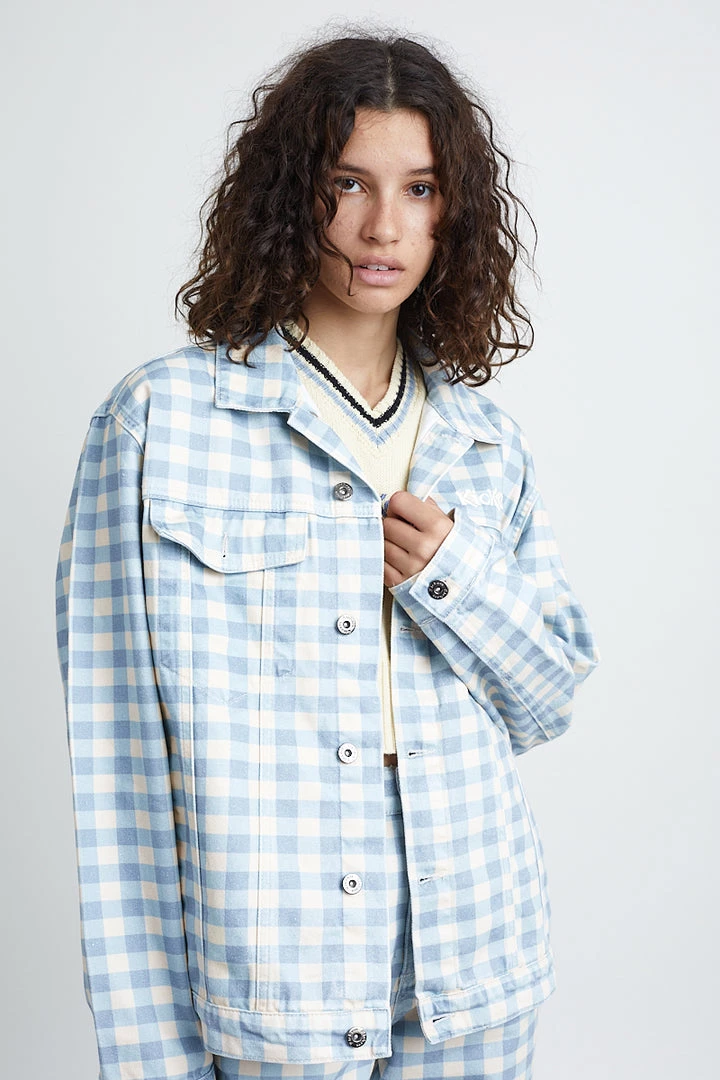 Kickers Classics gingham classic denim jacket with button up front and small kickers embroidered logo.