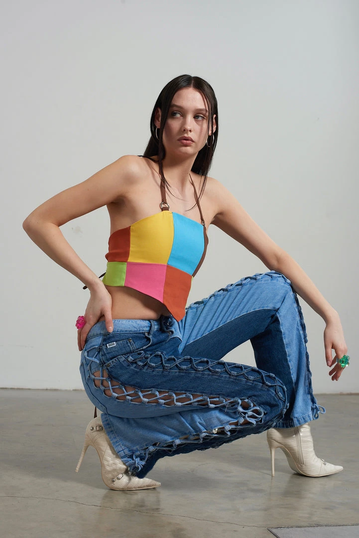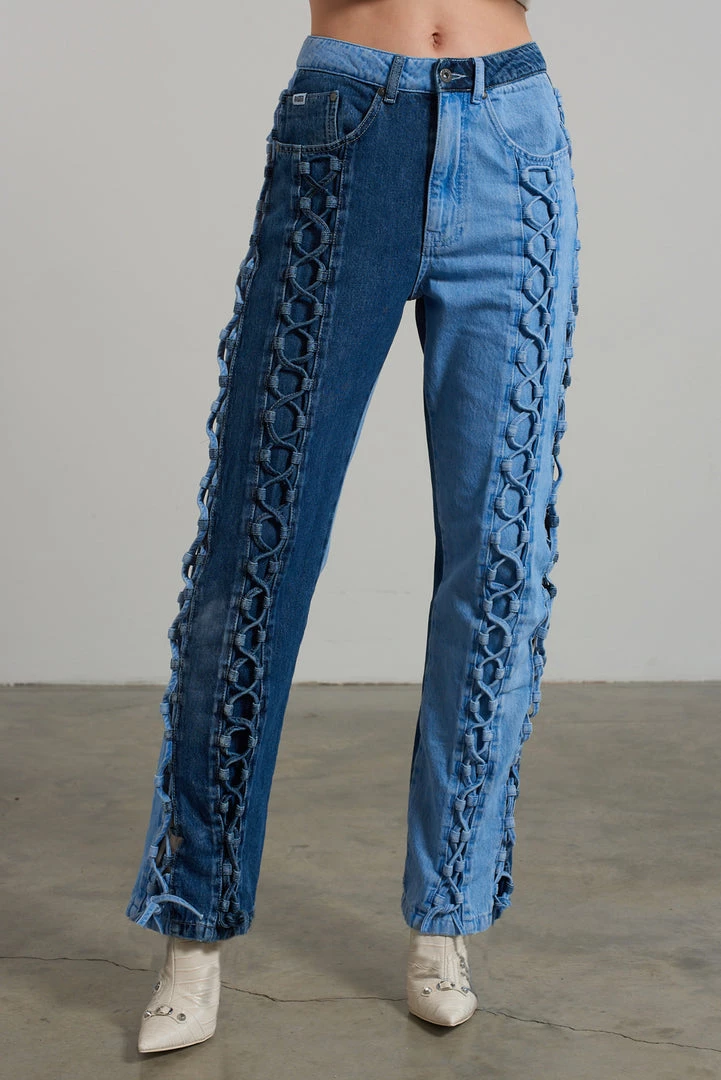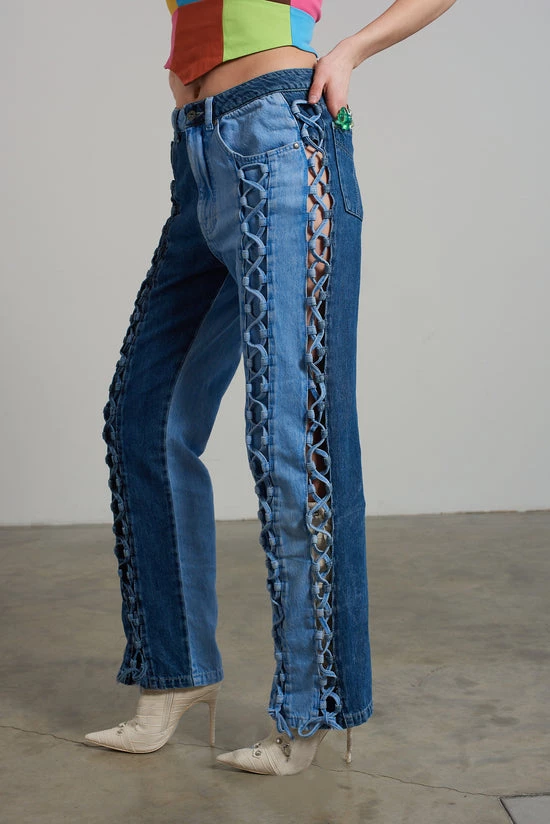 Ragged Jeans half and half blue denim dad jean with lace-up detail.