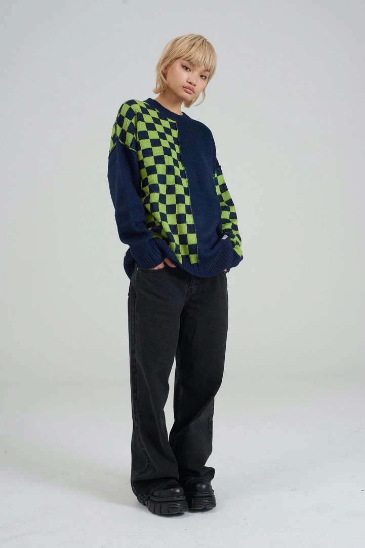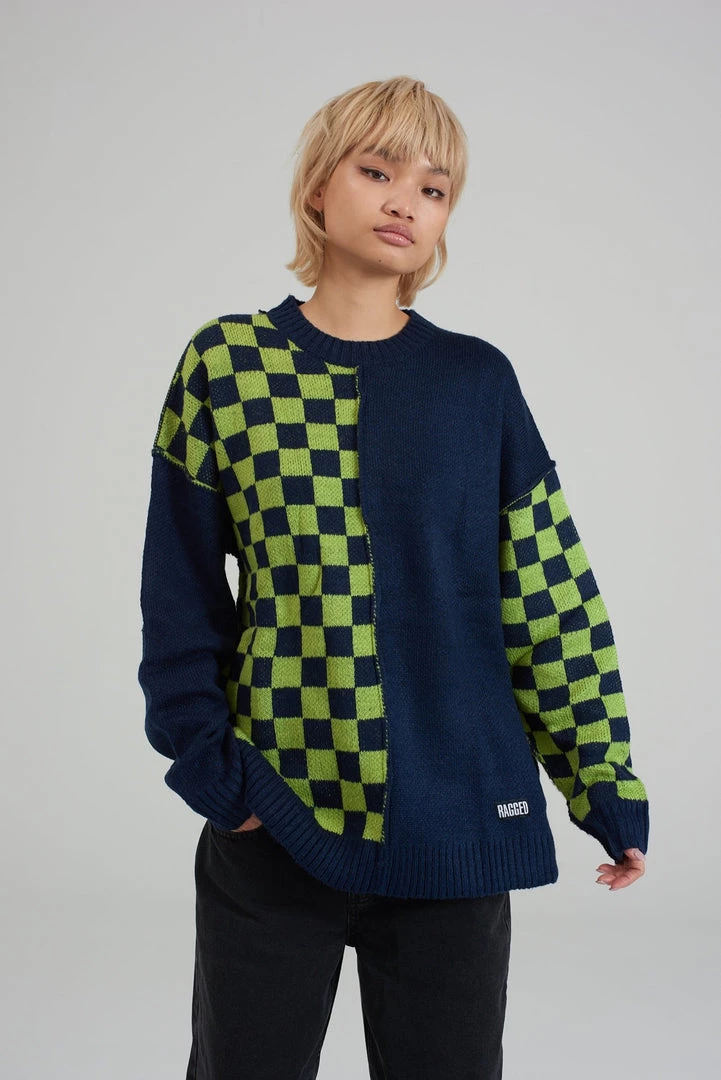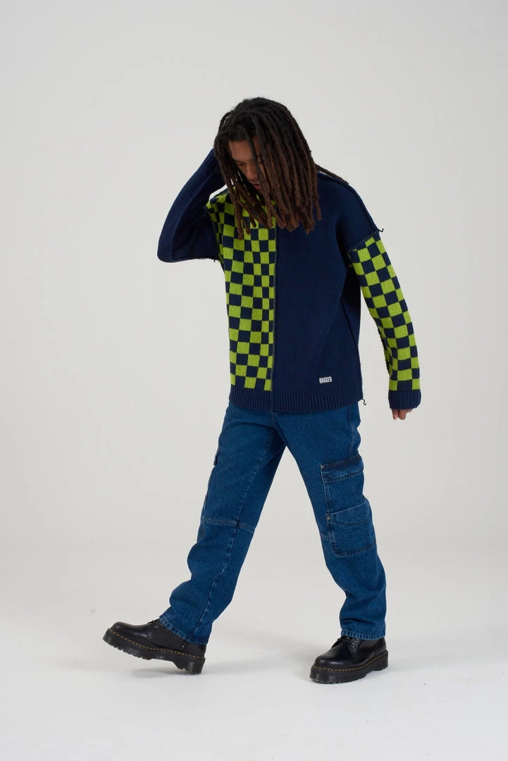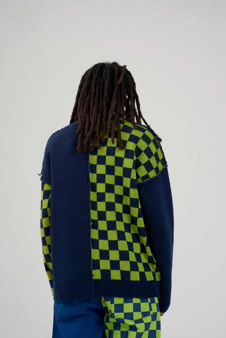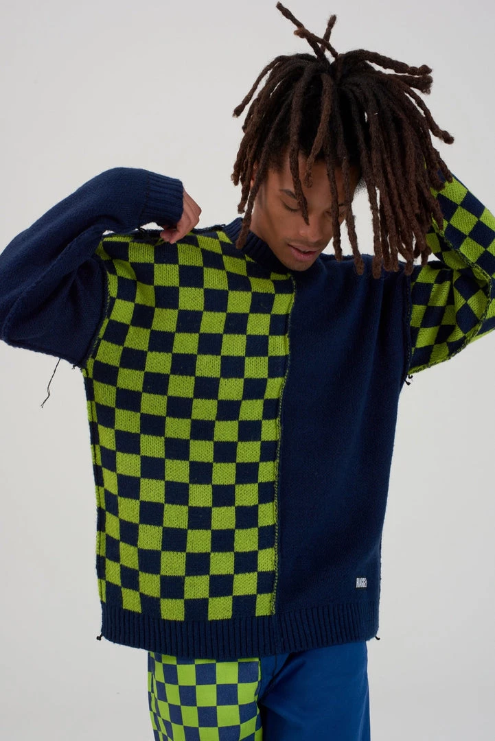 Ragged Jeans mens half and half blue and green checkerboard long sleeve knitted jumper.