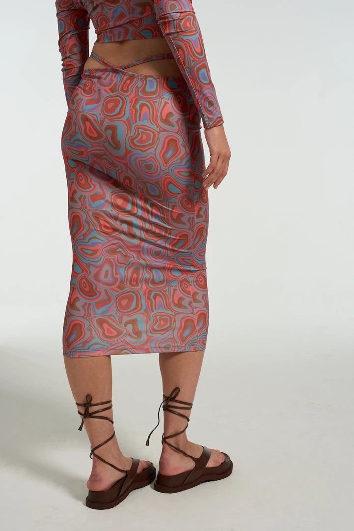 The Aura Skirt is our maxi skirt with multicoloured crystal print and tie up waist V detail.
