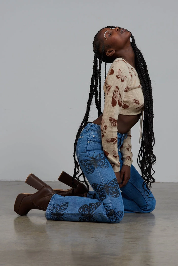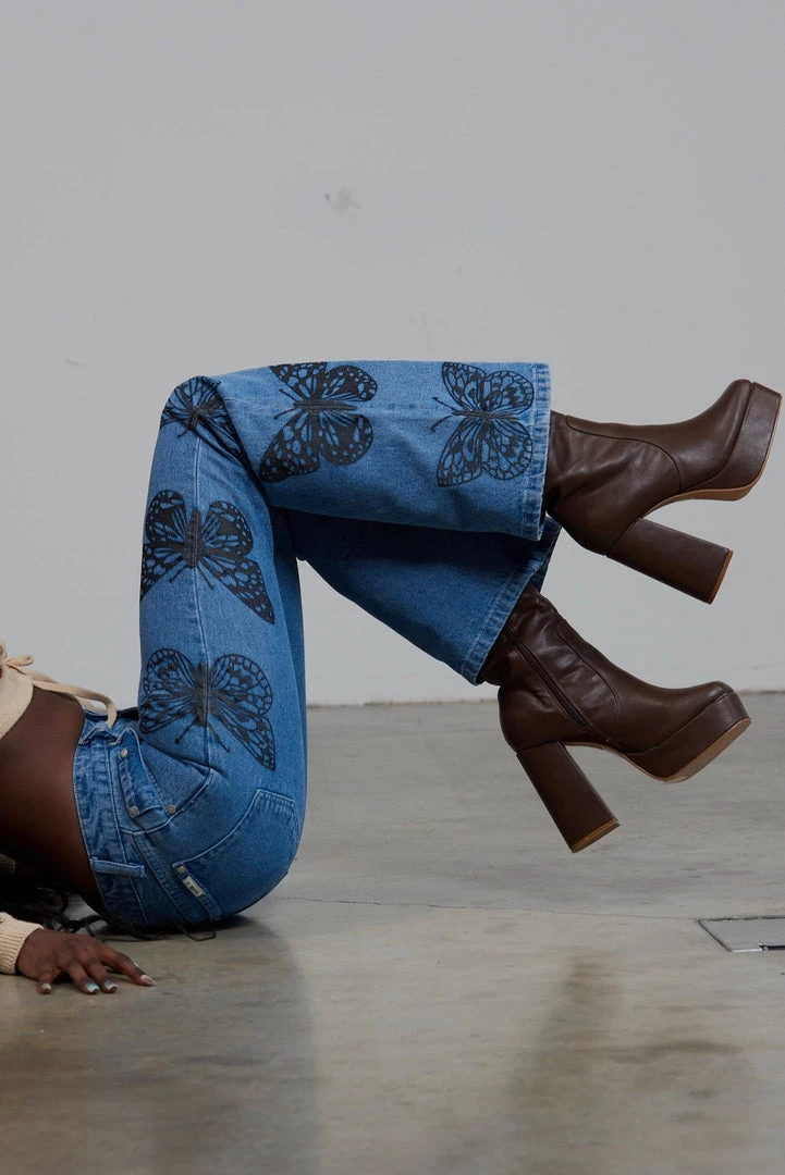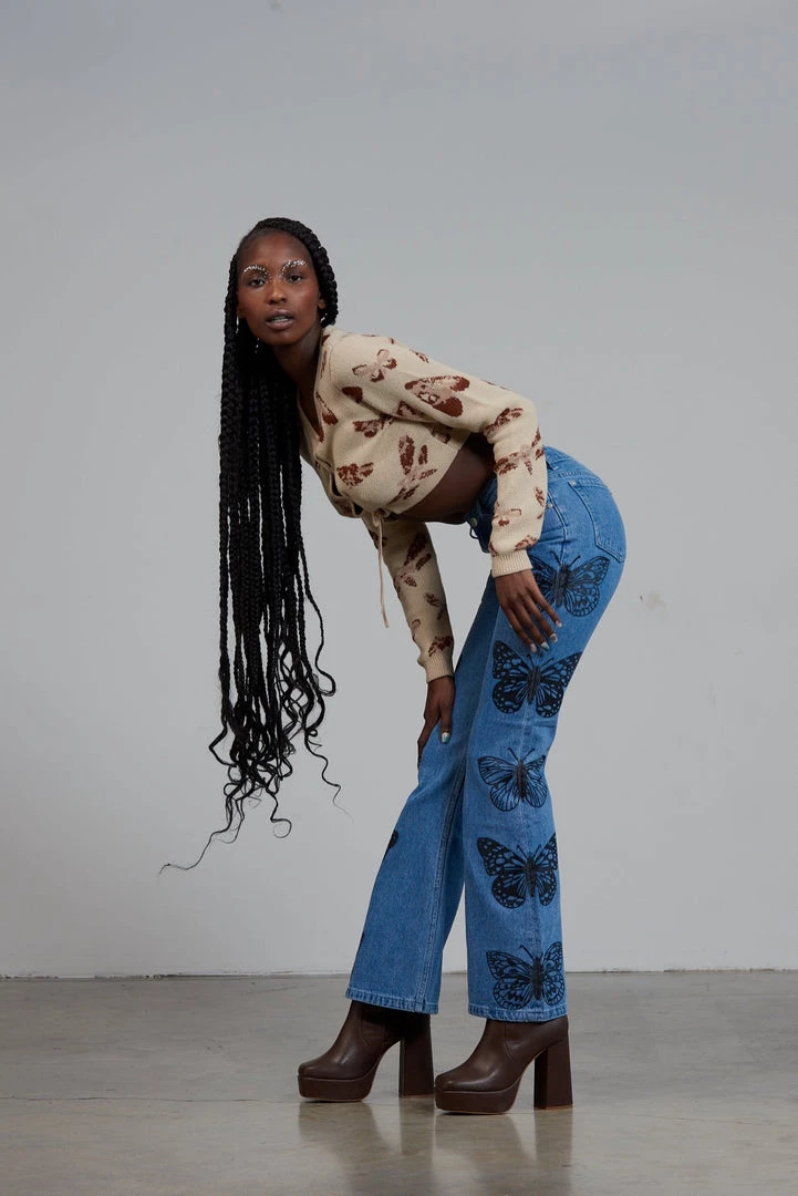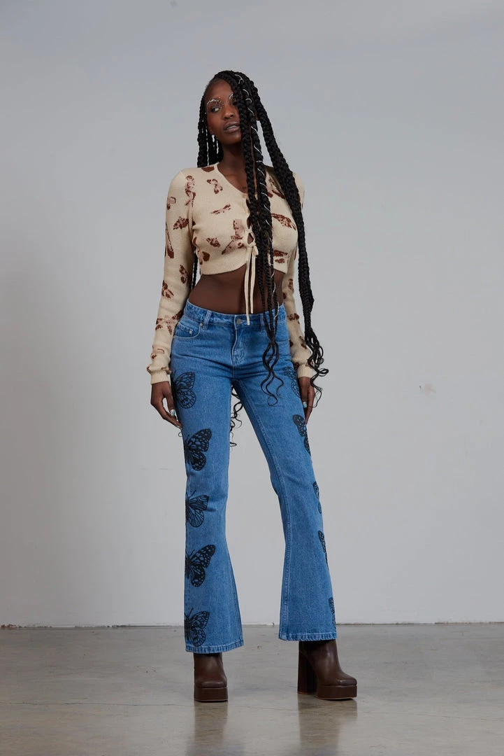 The Cocoon Jeans are our blue denim flared fit jeans with a statement moth and butterfly print along the side of each leg. These jeans are Crafted from 50% recycled cotton and are a mid rise jean.Â
