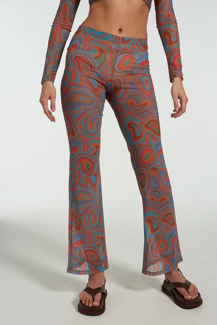 The Crystal Flares are our mesh trousers with flared legs and multicoloured crystal print.