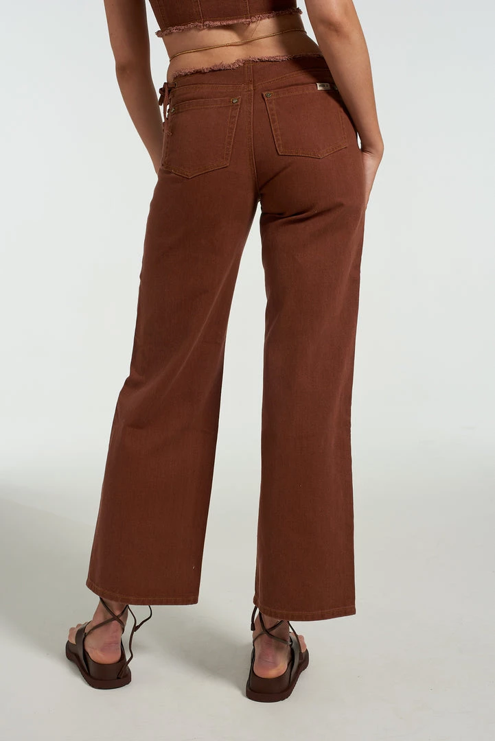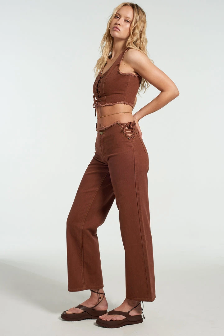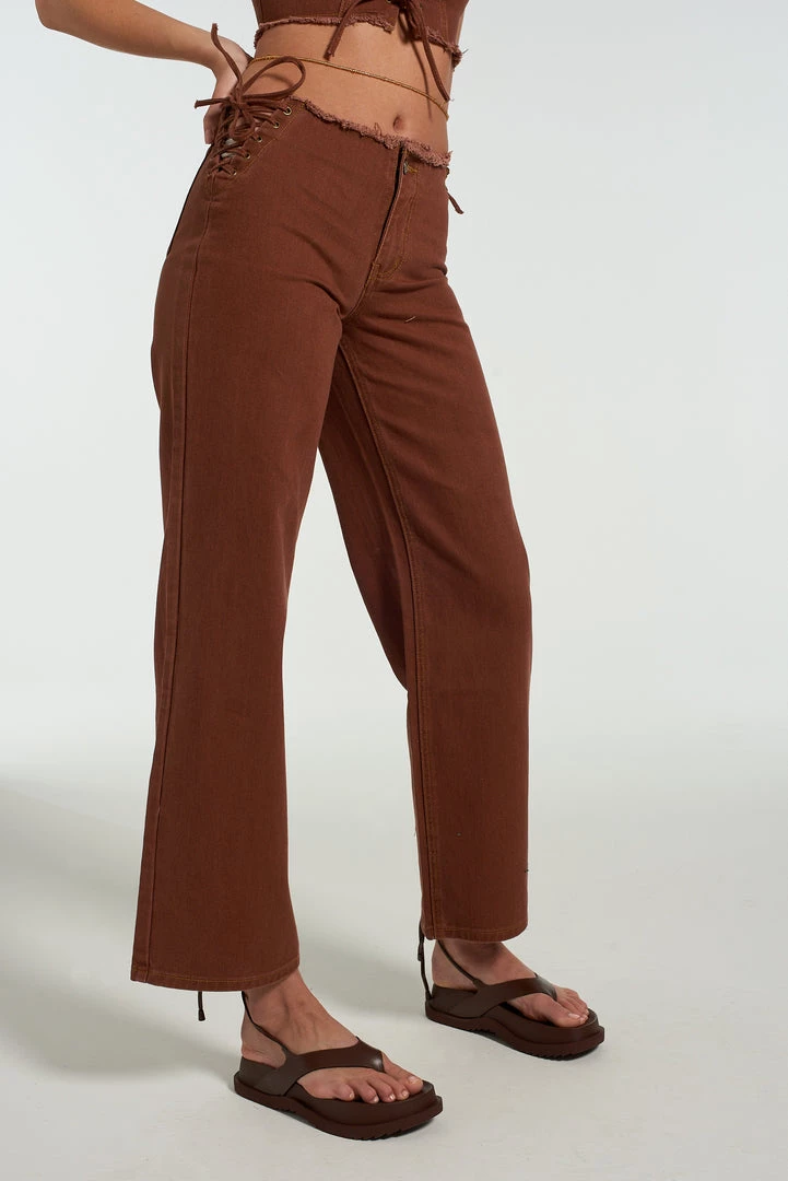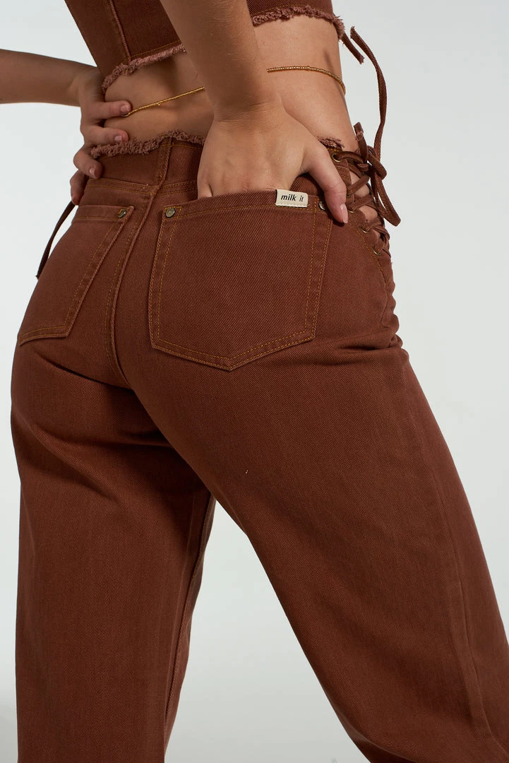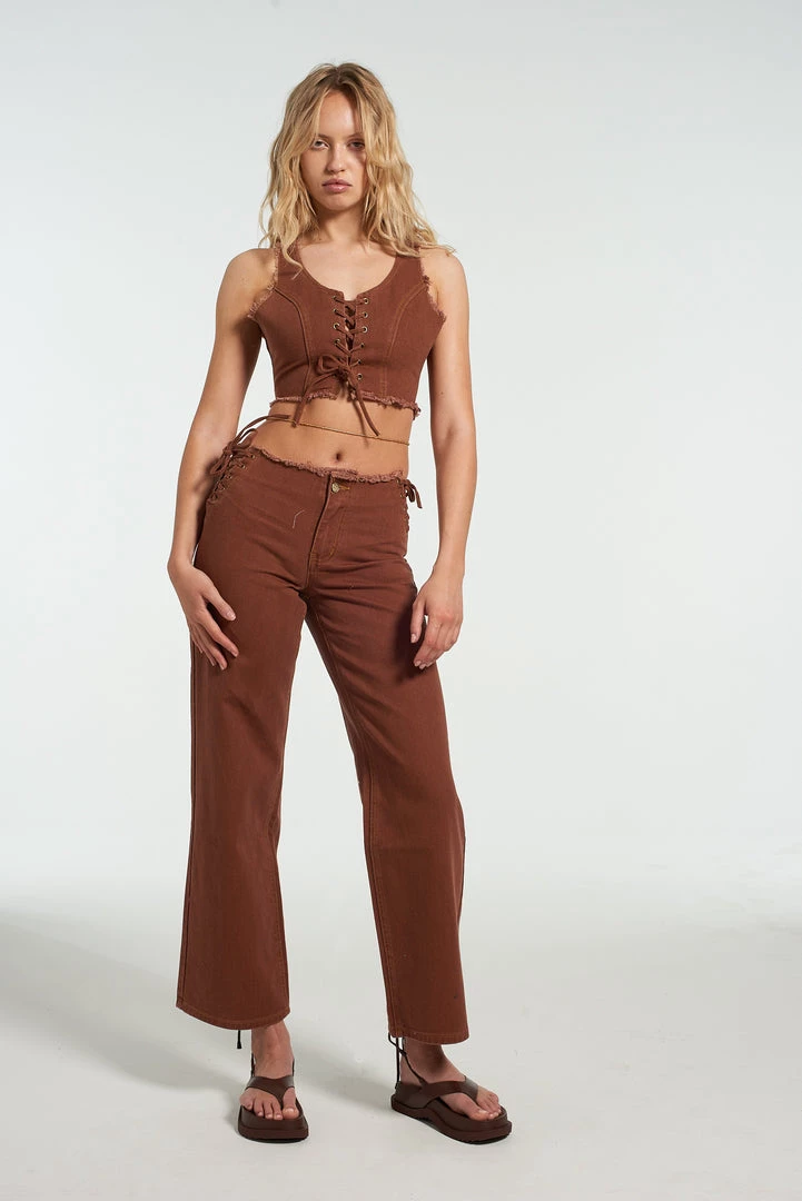 The Earth jeans are our brown low rise, straight leg jeans with lace up side waist detail and raw hem frayed waistband.