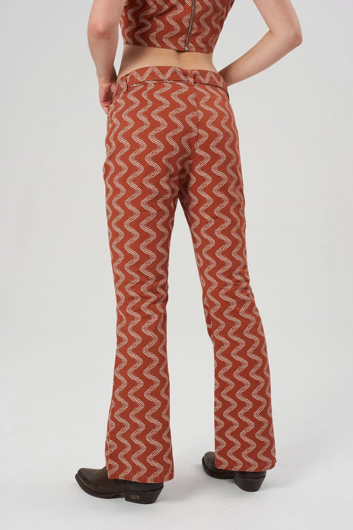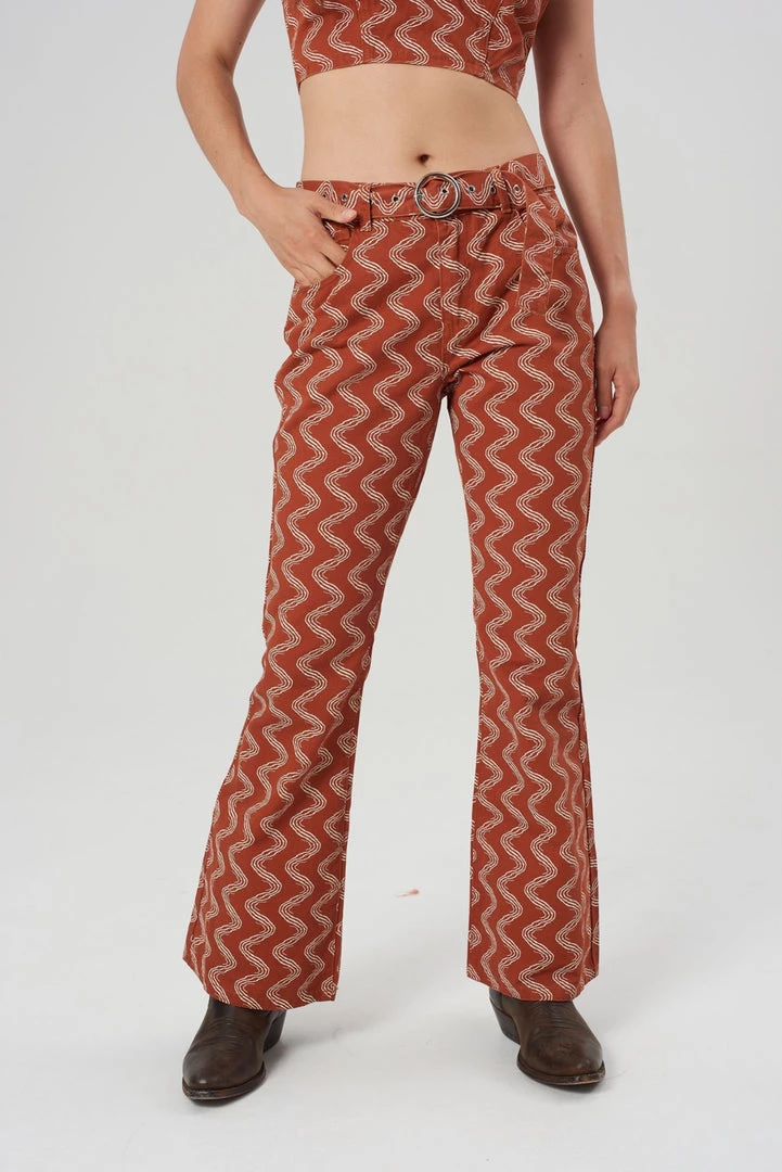 The Lure Pant is our rust wiggle print pant with circular buckle belt.