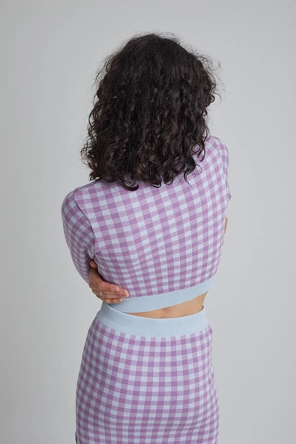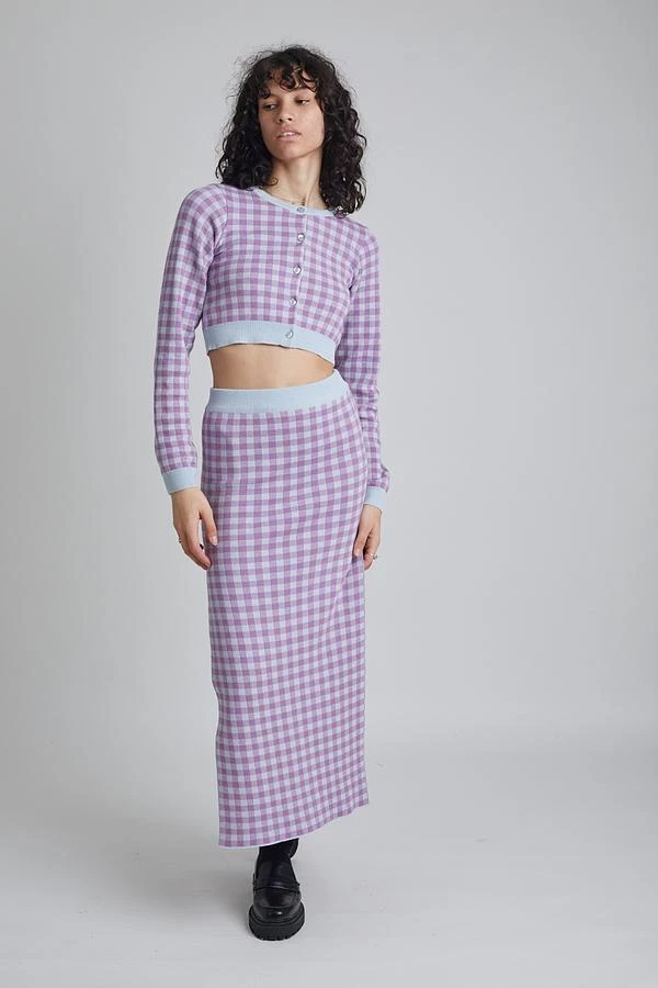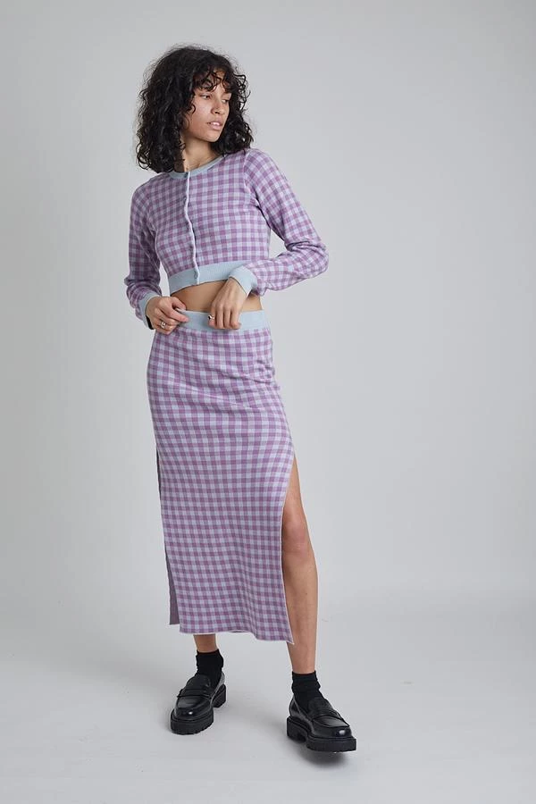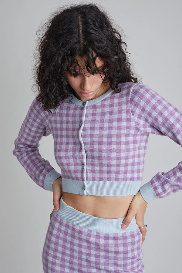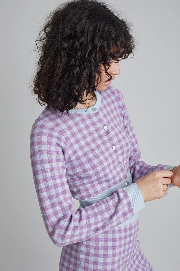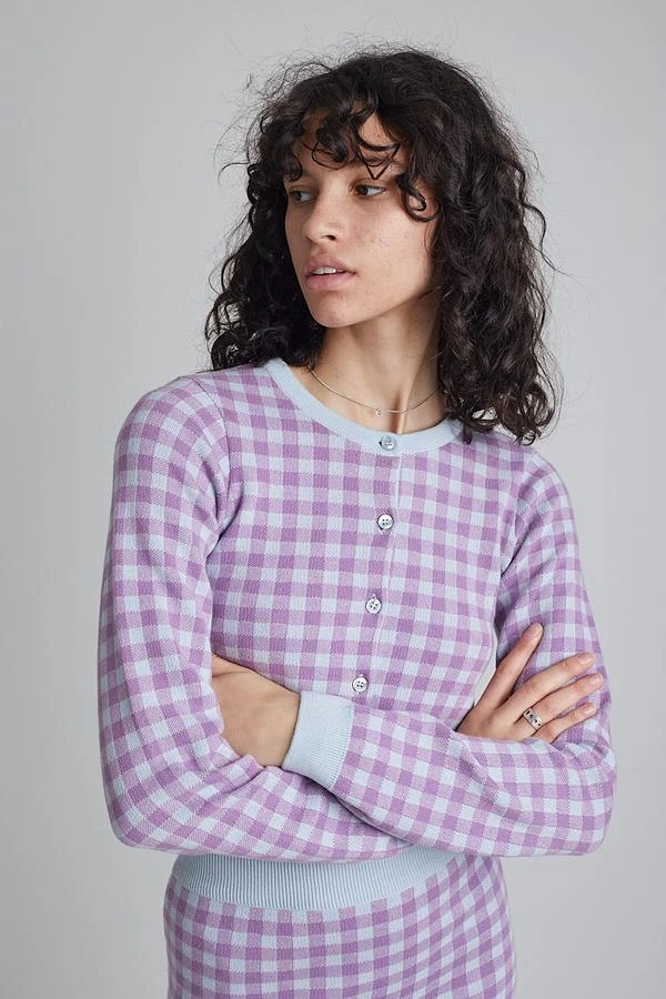 The Meadow knit is our lilac and blue check design knitted button up top / cardigan. Crafted from 60% recycled cotton and 40% recycled polyester, this top features a blue cuff and neckline finishing and button up font.Â