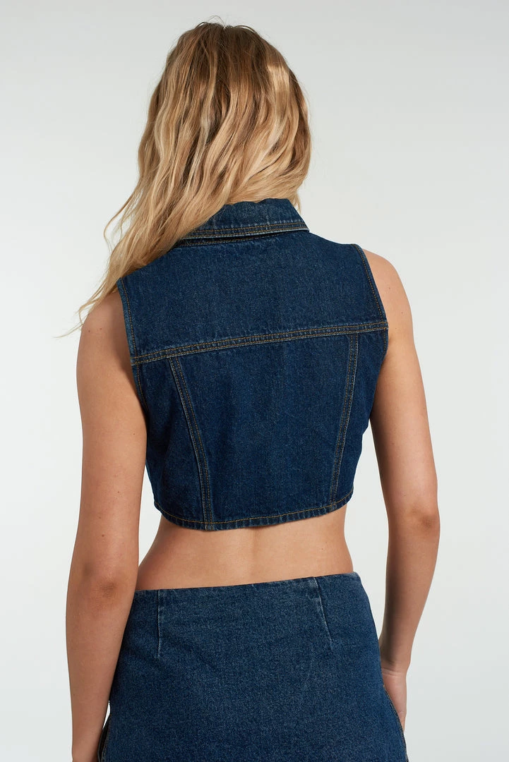 The Melt crop top is our denim waistcoat style top with collar detail and central hook and eyes.