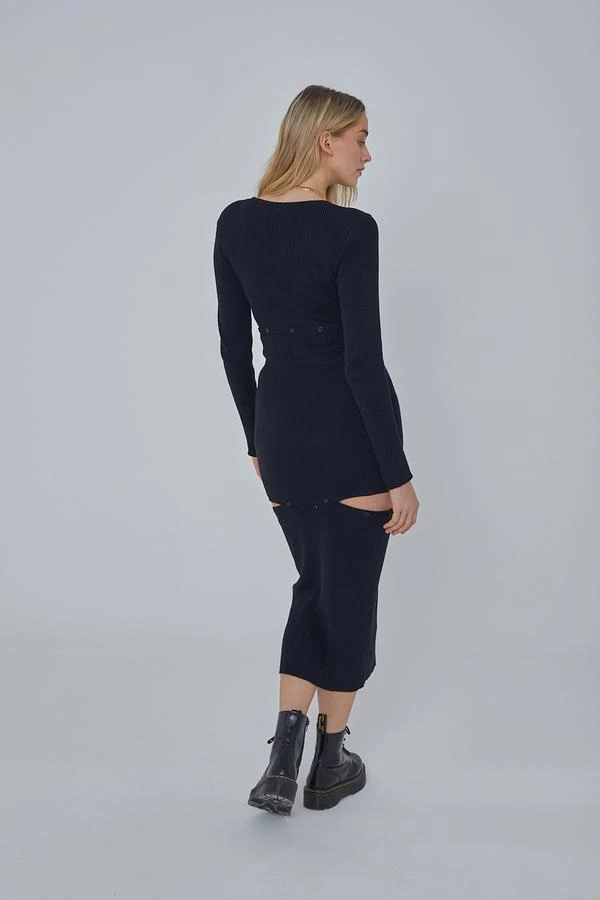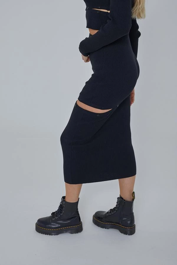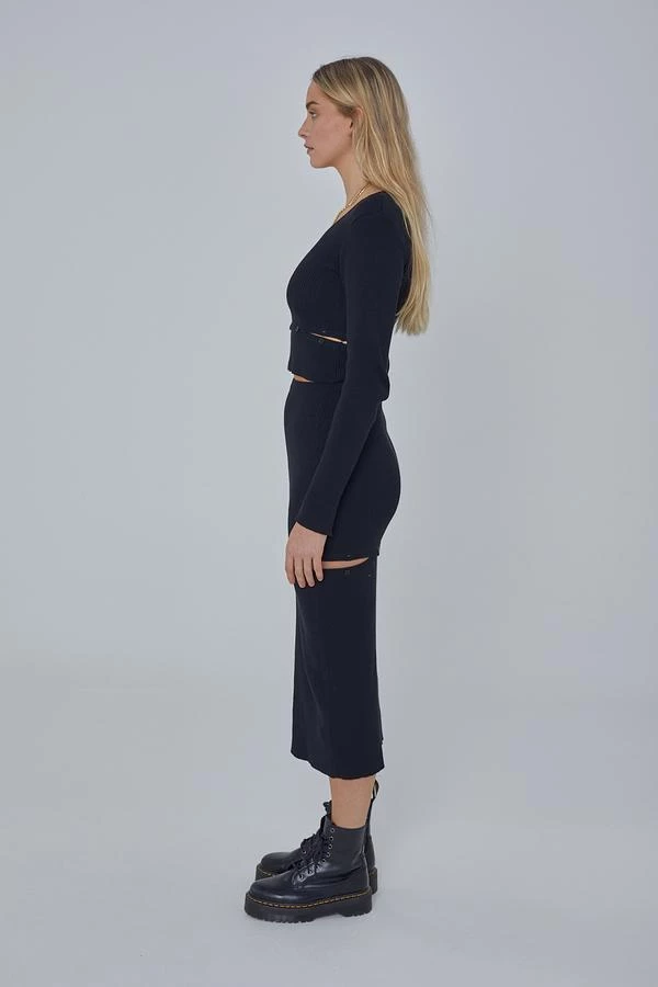 The Opal skirt is our recycled black ribbed midi skirt. Crafted from recycled polyester and cotton, this midi skirt features a cut out detail with button attaching panel. Â