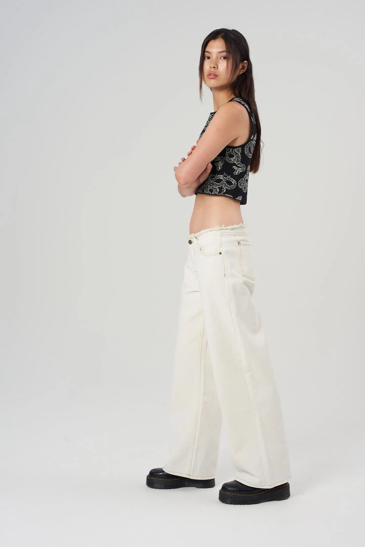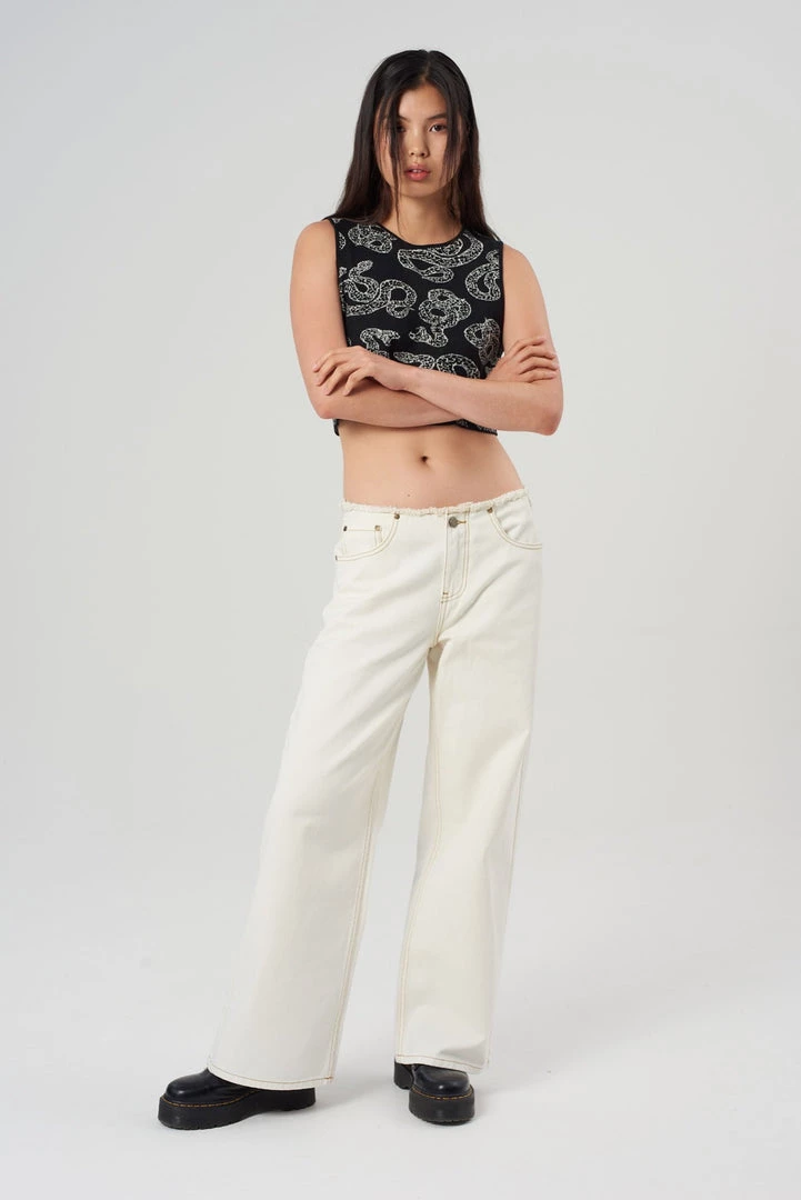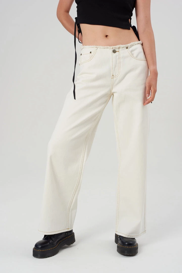 The Pure Jeans are our ecru denim low rise jeans with gold stitching detail.Â