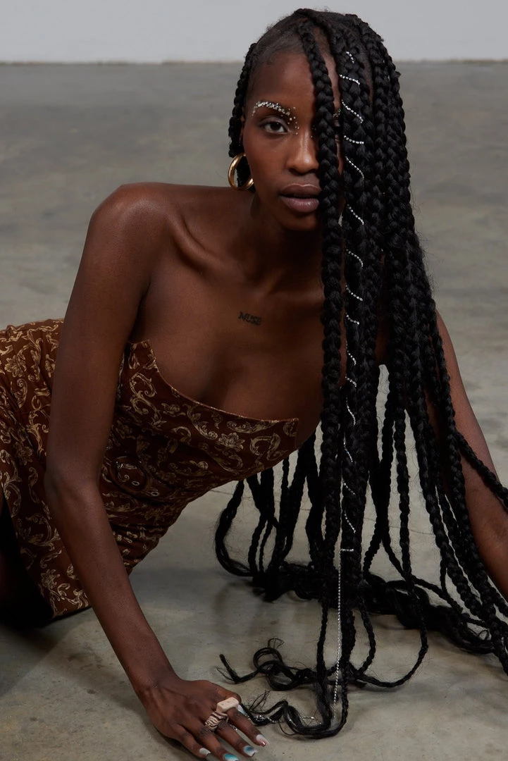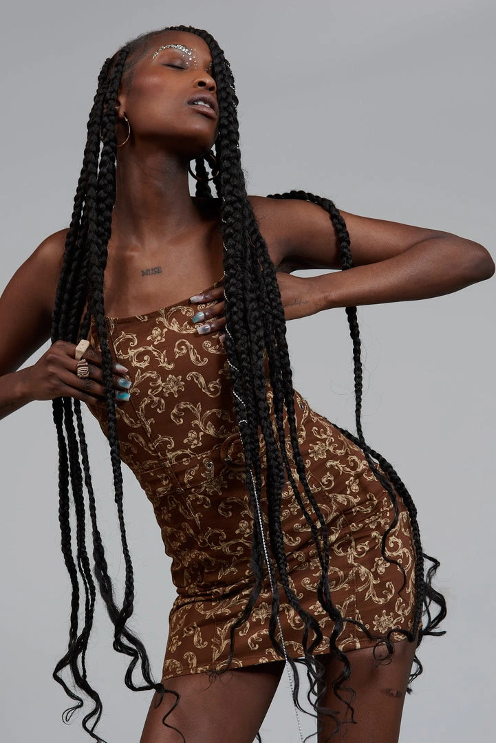 The Sinner Dress is our brown strapless mini dress with filigree design. Crafted from 50% recycled cotton this dress features a circle buckle waist belt detail, a strapless neckline and two tone statement design.Â