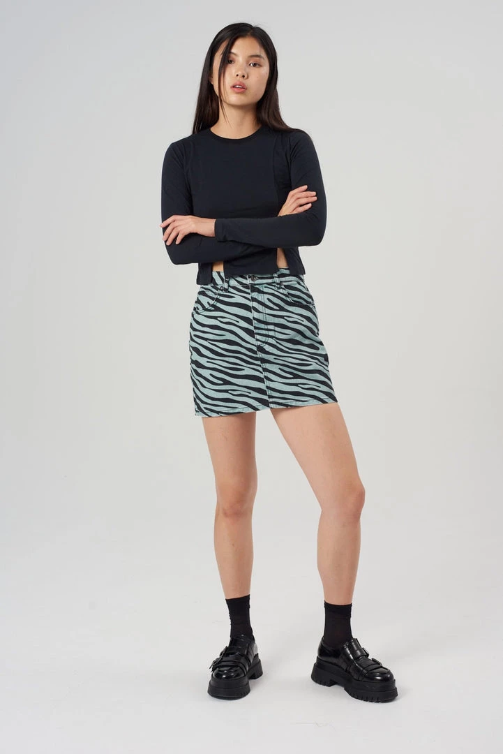 The Tiger Skirt is our blue tiger print denim mini skirt. Crafted from 100% organic cotton.