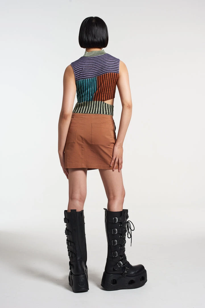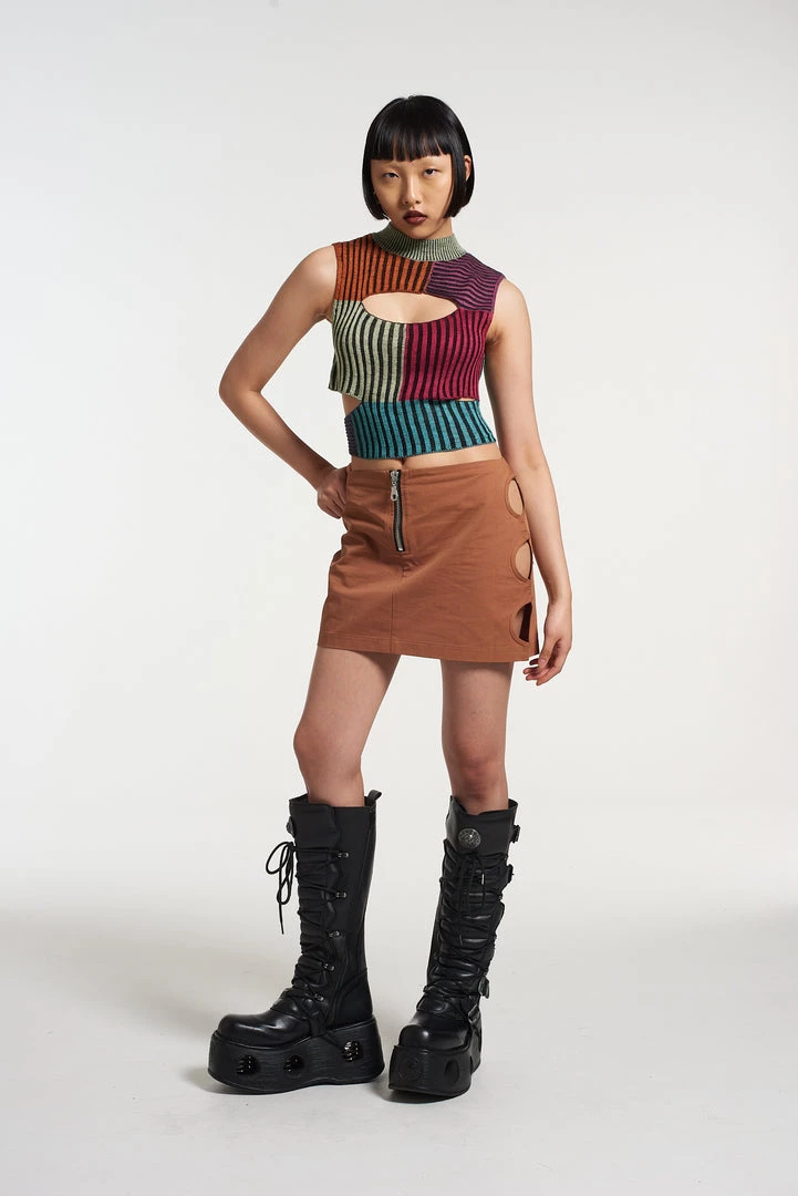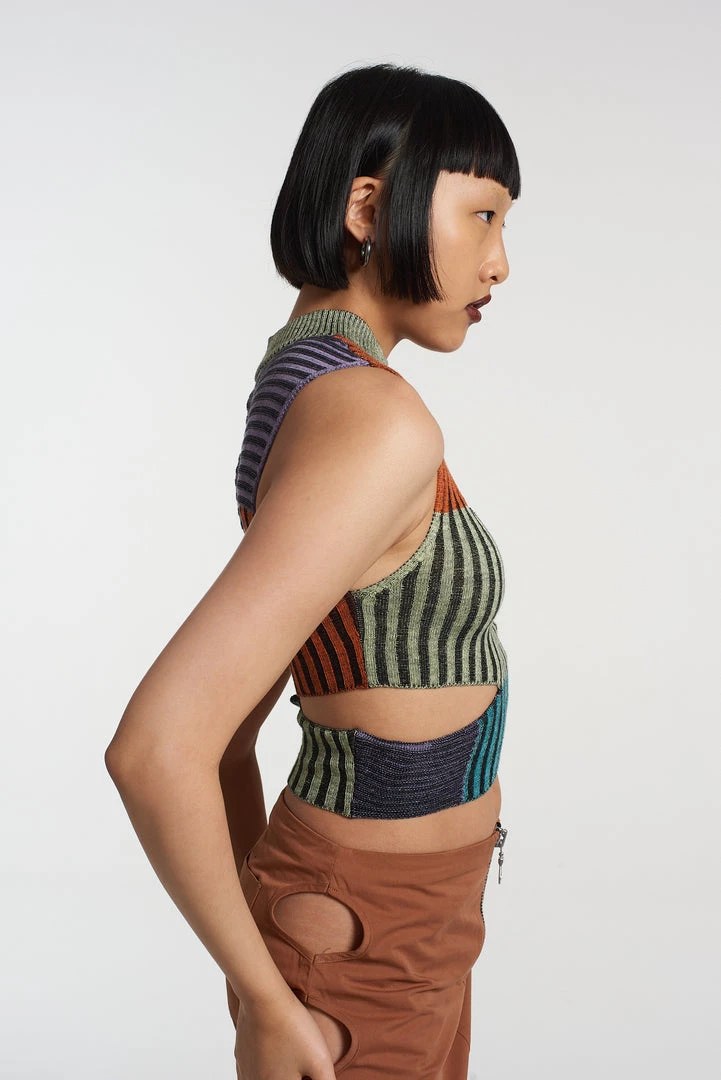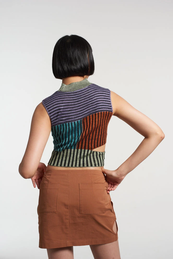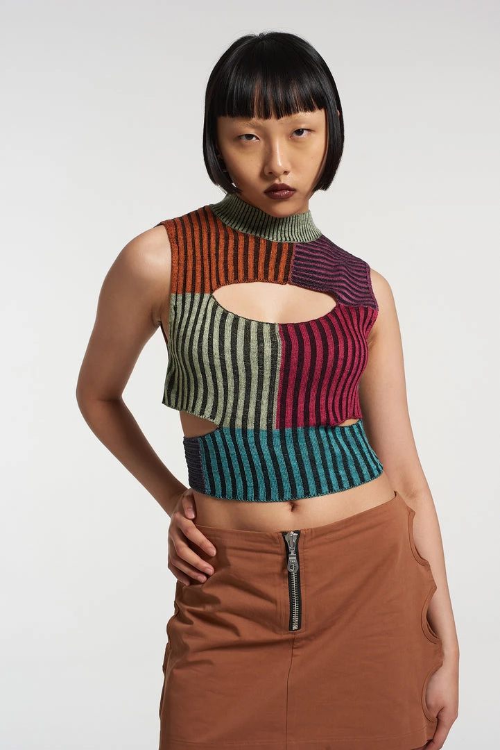The Ragged Priest mix stripe multicoloured crop top. High neck, cropped fit with cut out chest and waist detail.