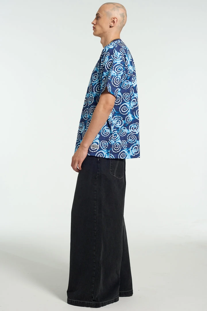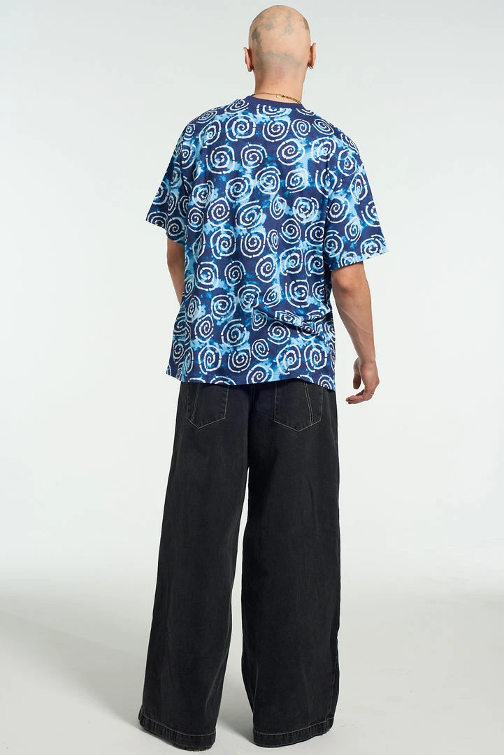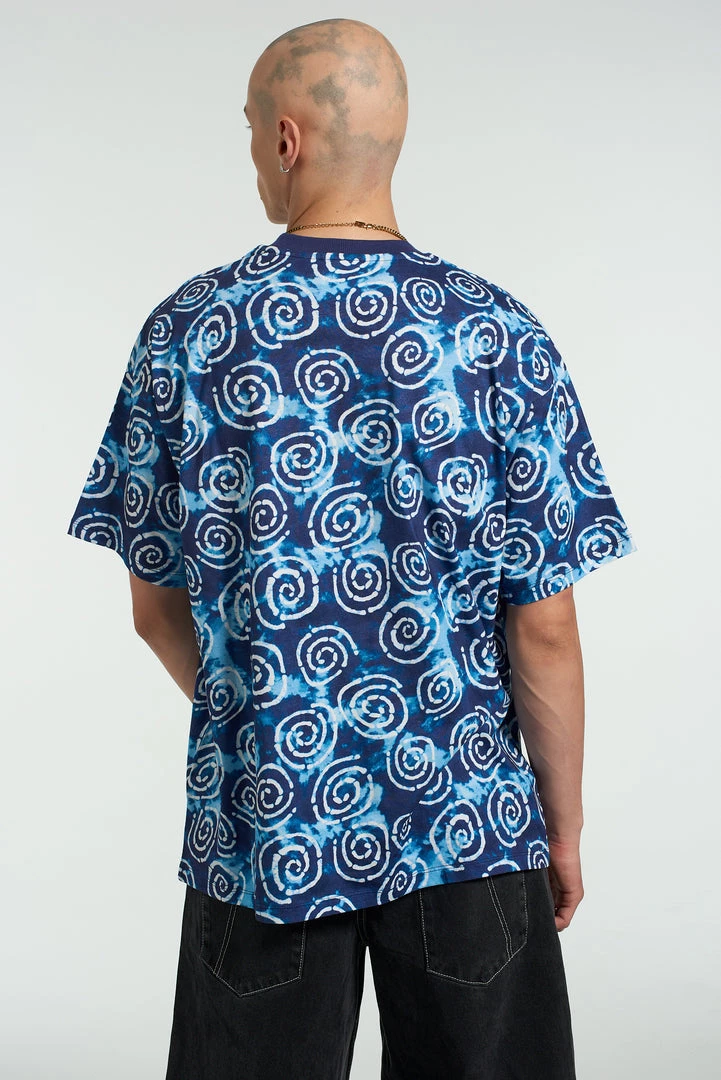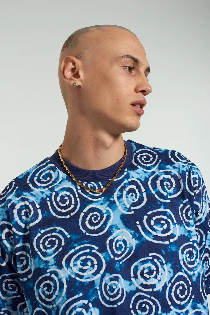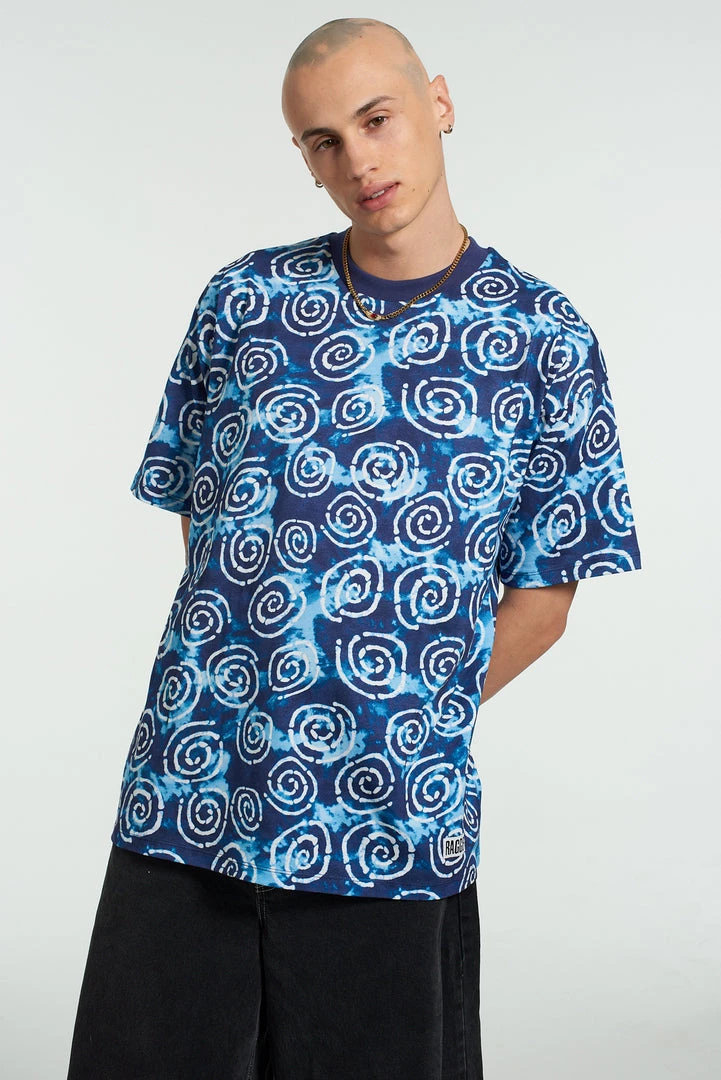 The Ragged Priest men’s Batik inspired swirl print t-shirt in navy and white.