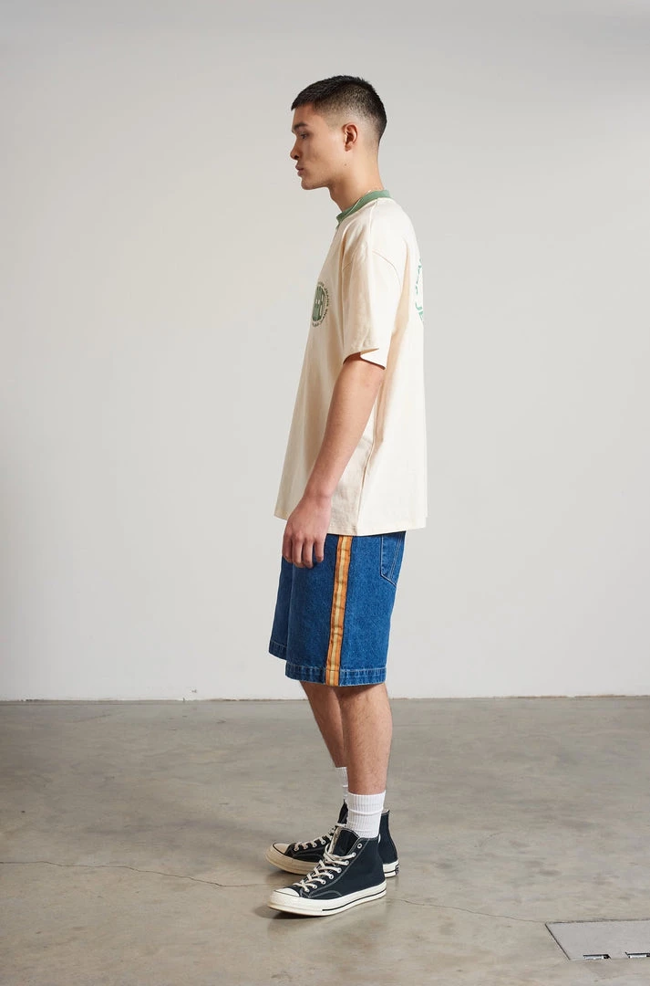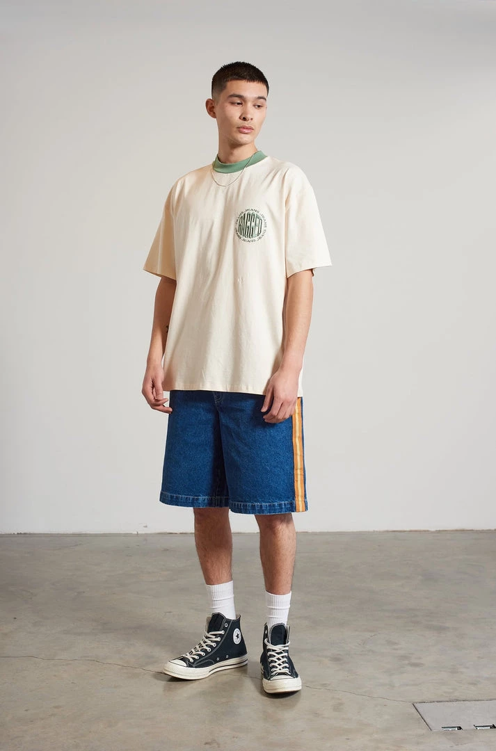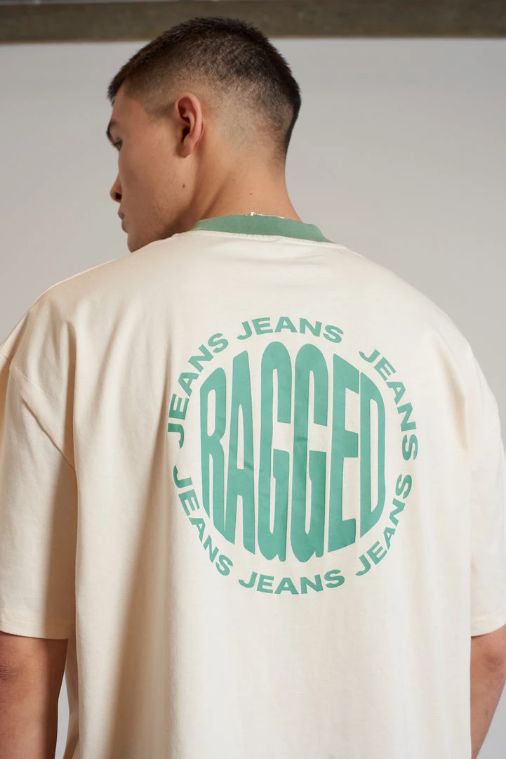 Ragged Jeans mens cream oversized short sleeve tee with embroidered Ragged logo and oversize back logo.