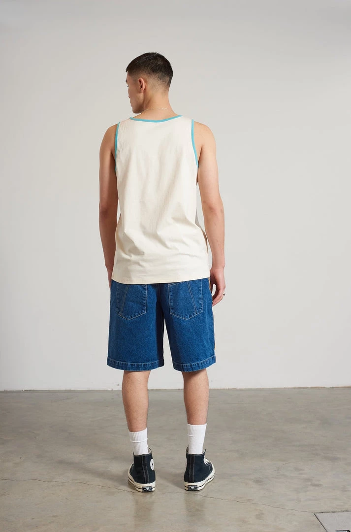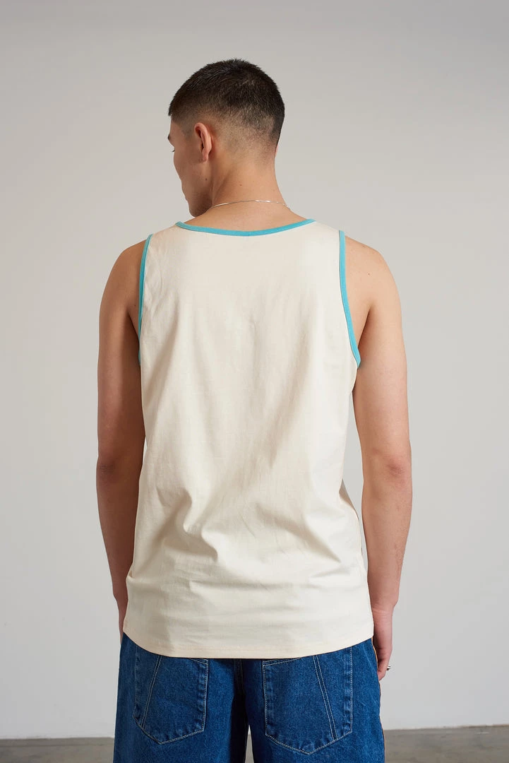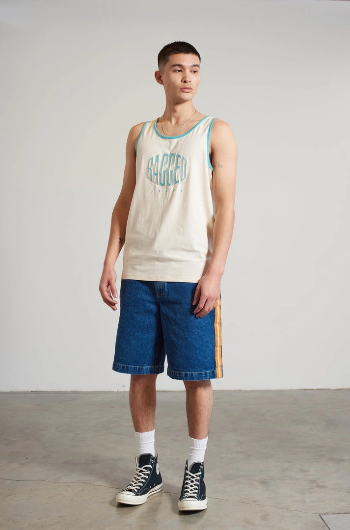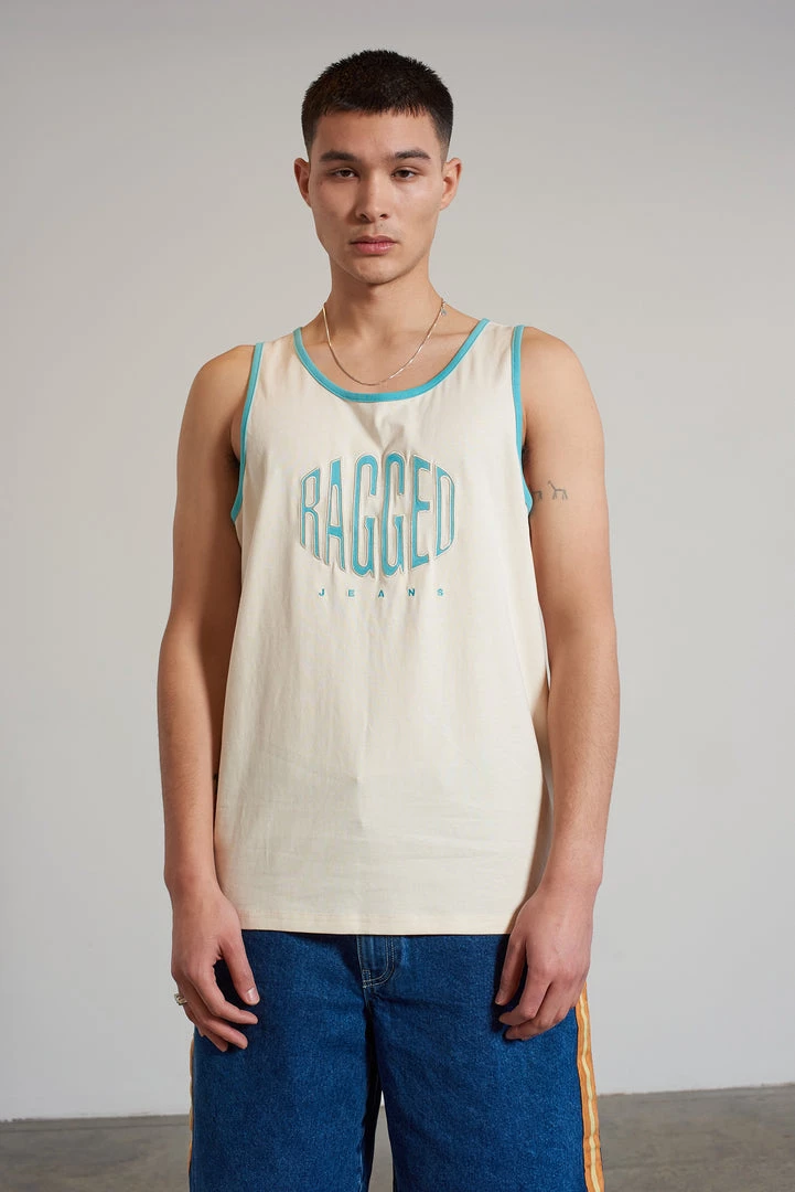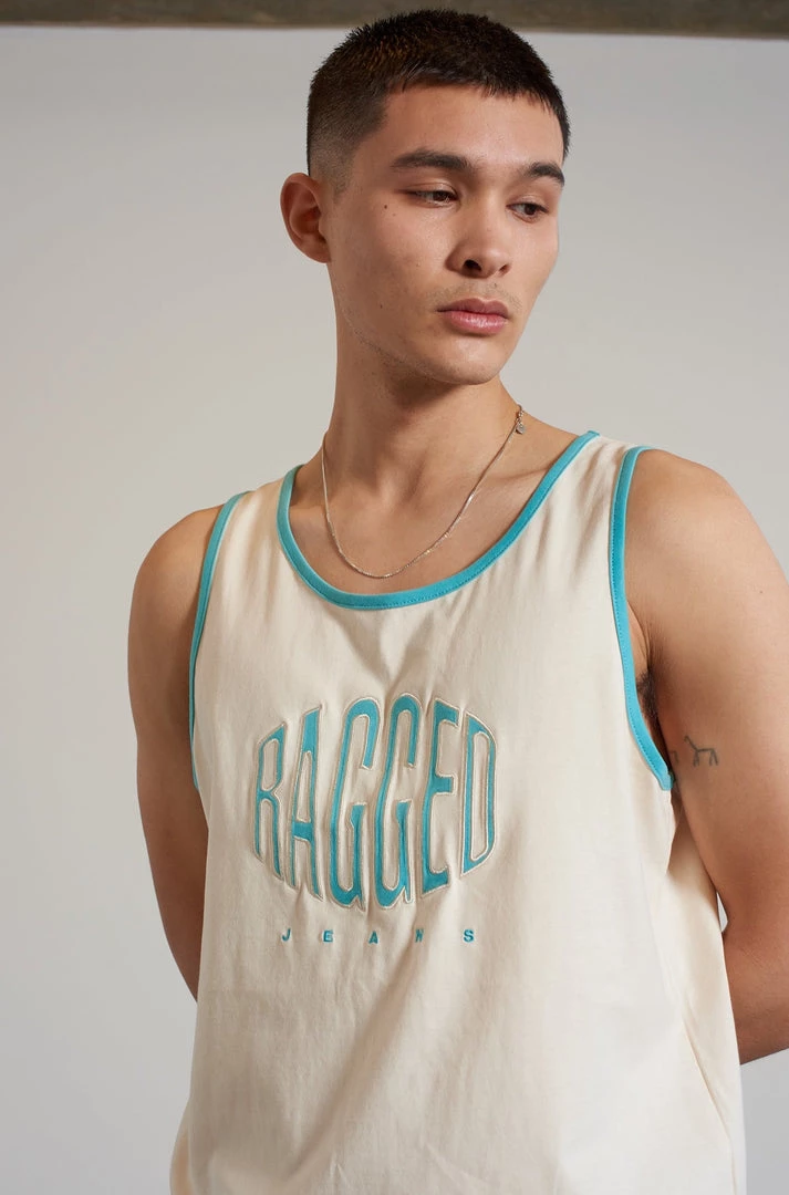 Ragged Jeans mens white tank top with oversized Ragged logo.