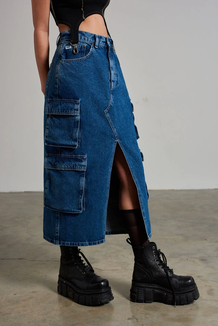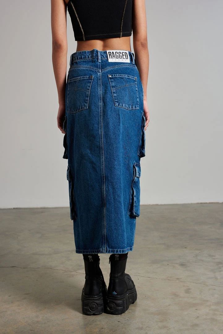 Ragged Jeans blue denim midi length combat skirt with side pockets and front split detail.