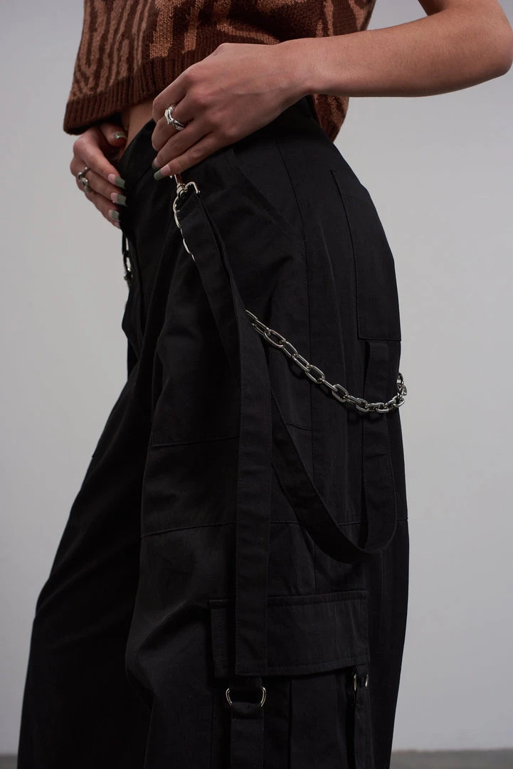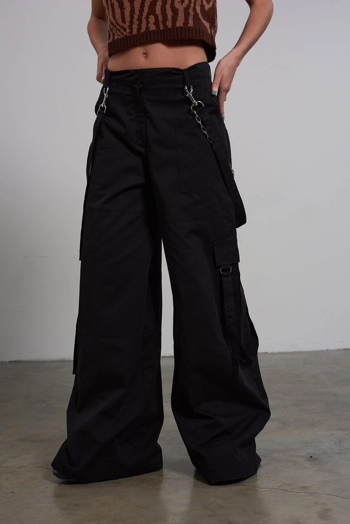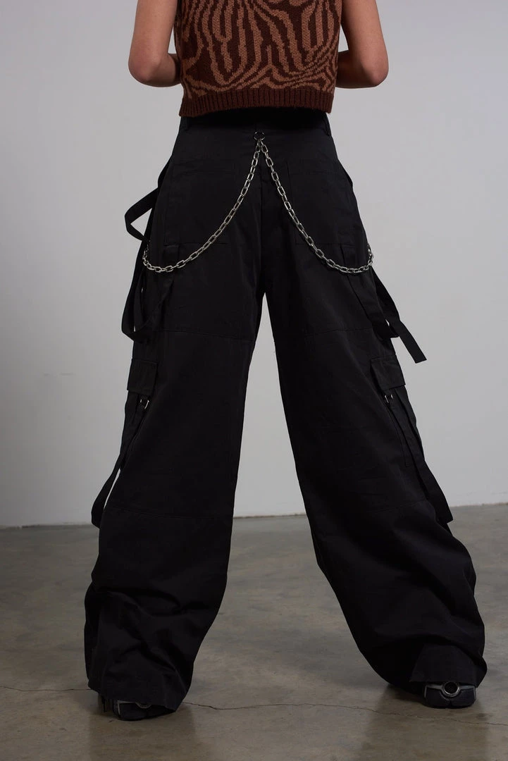 The Ragged Priest black super wide leg combat pant with straps and chains detail.