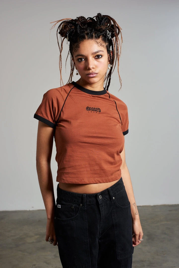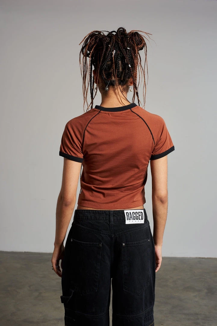 Ragged Jeans brown short sleeve top with raglan sleeves, black trim, and black ‘Ragged Jeans’ embroidered logo.