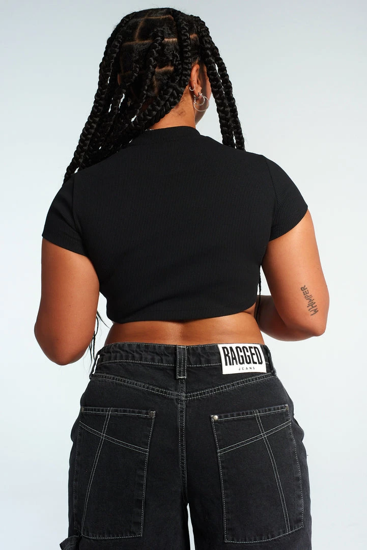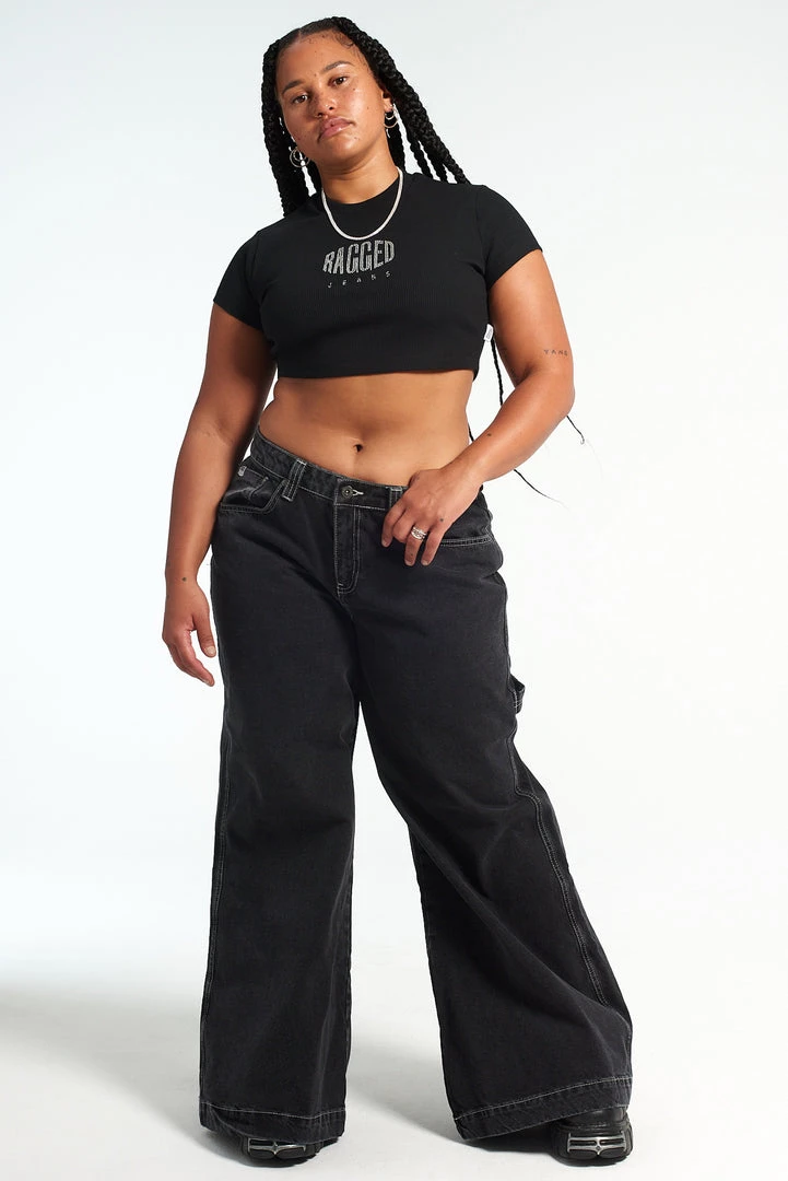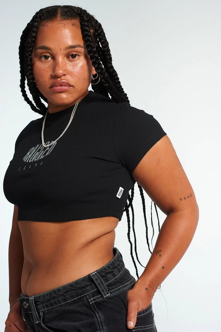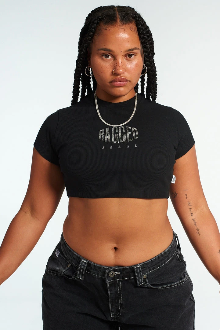 The Ragged Priest black short sleeved t-shirt cropped top with central “RAGGED” diamanté logo.Â
