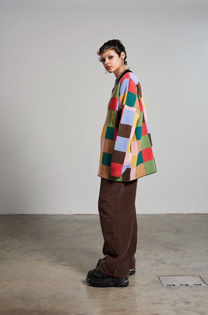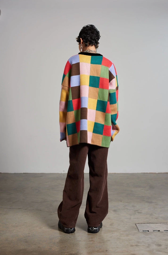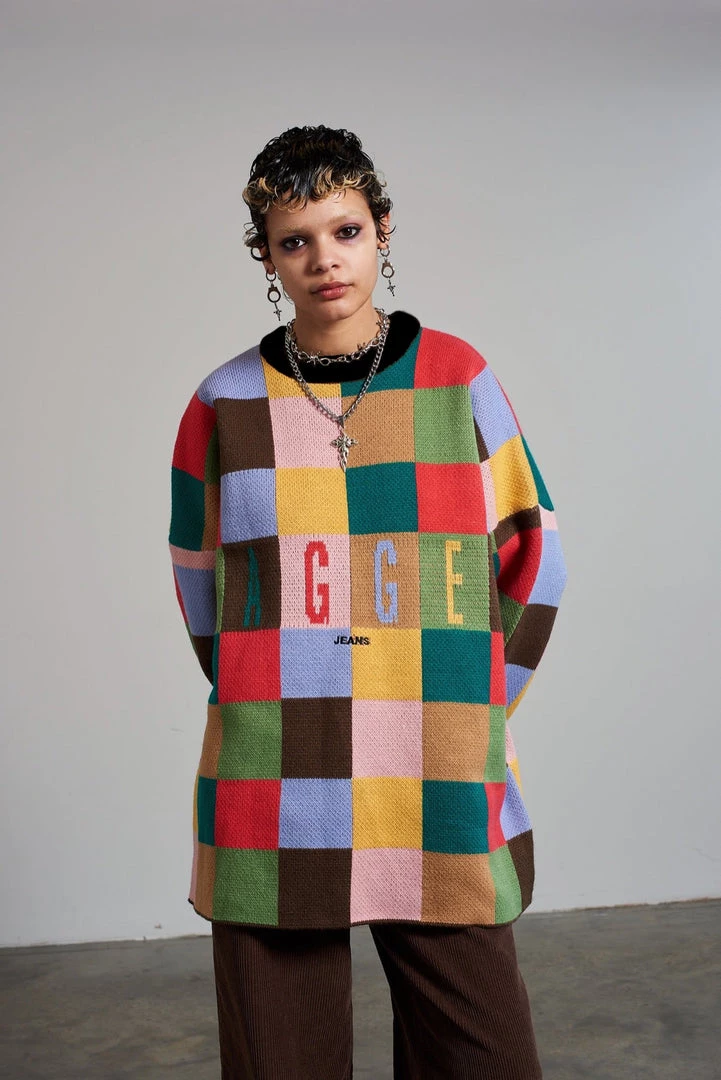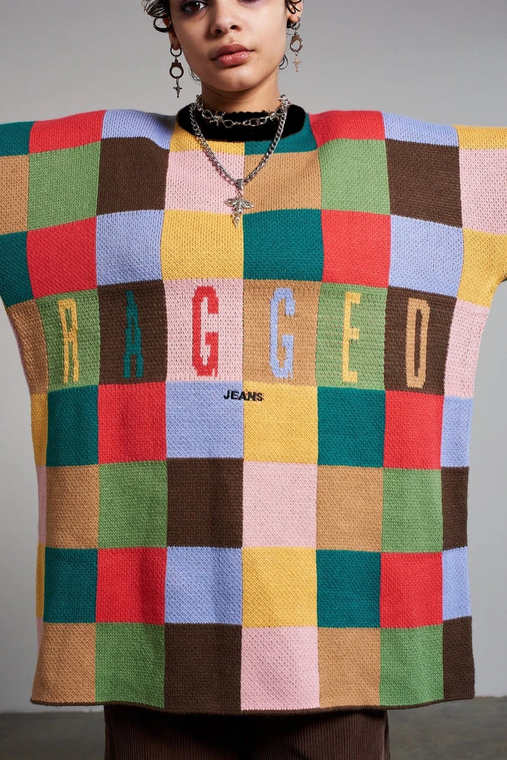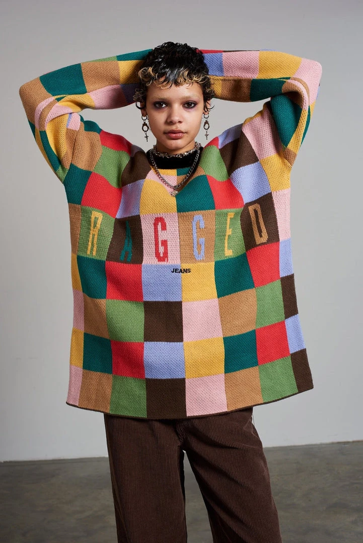 Ragged Jeans multicolour checkerboard oversized jumper with ‘Ragged Jeans’ chest logo.