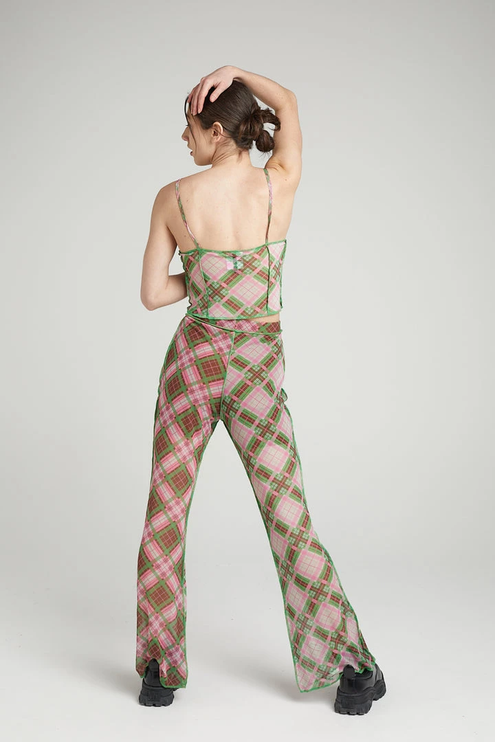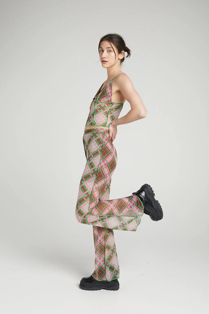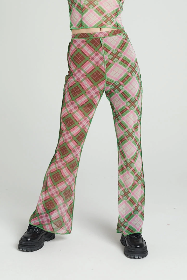 The Ragged Priest high waisted half and half check mesh flared trousers with exposed seams.