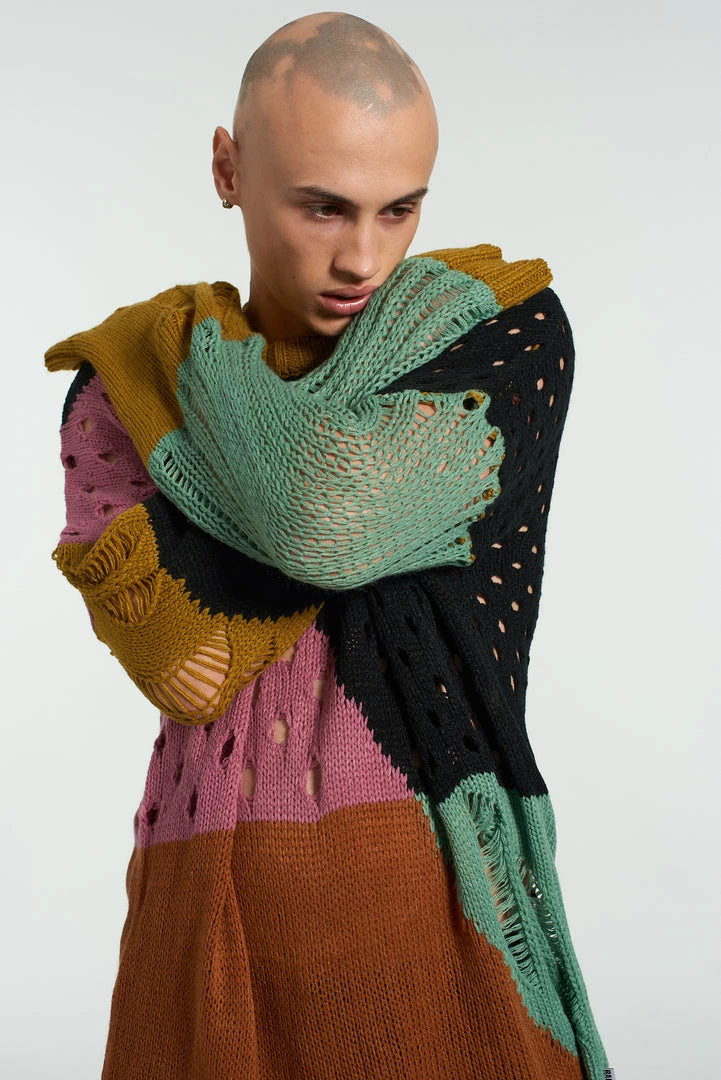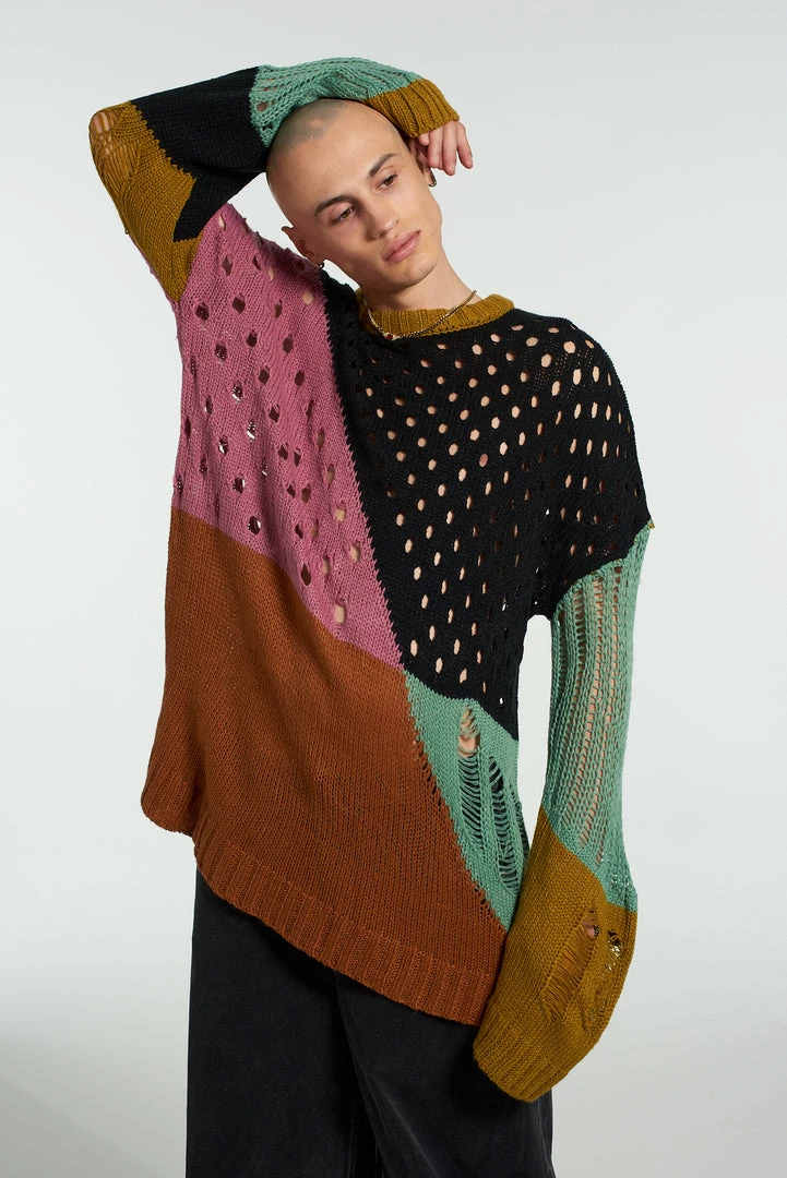 The Ragged Priest men’s spliced hole jumper in black, pink, blue, orange, black and mustard yellow.