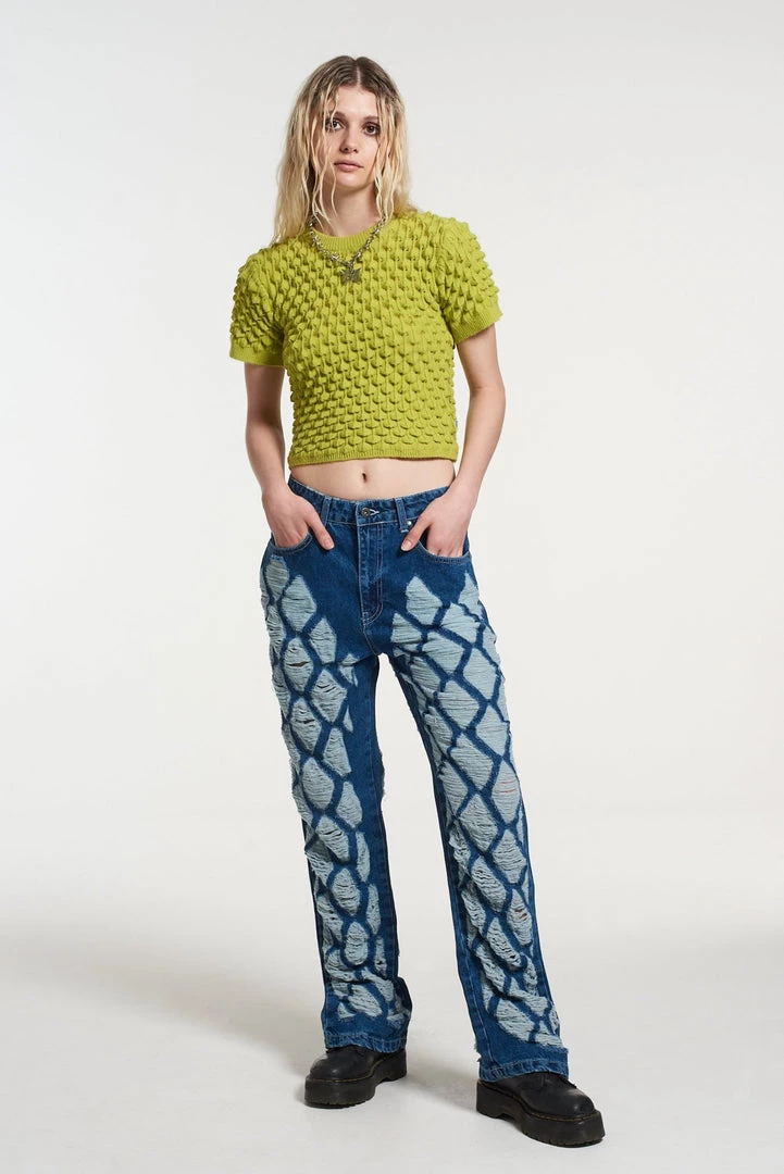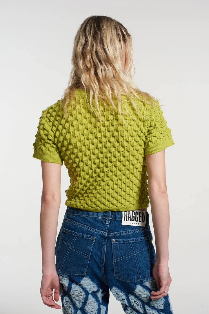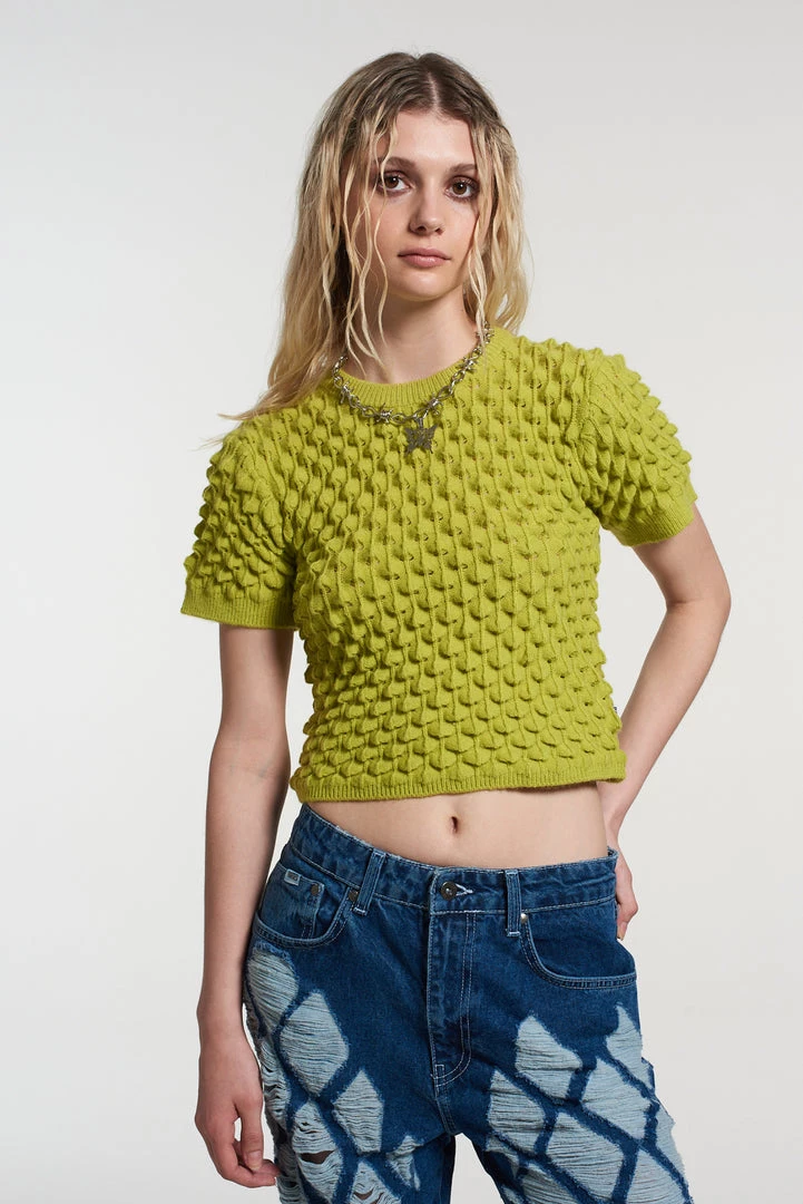 The Ragged Priest lime green popcorn style knitted short sleeved crop top.Â