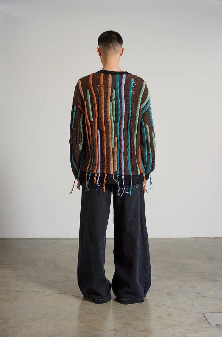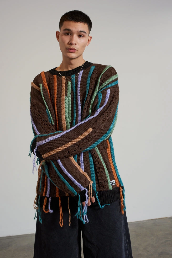Ragged Jeans mens brown knit jumper with multicolour loose thread stipe detail.