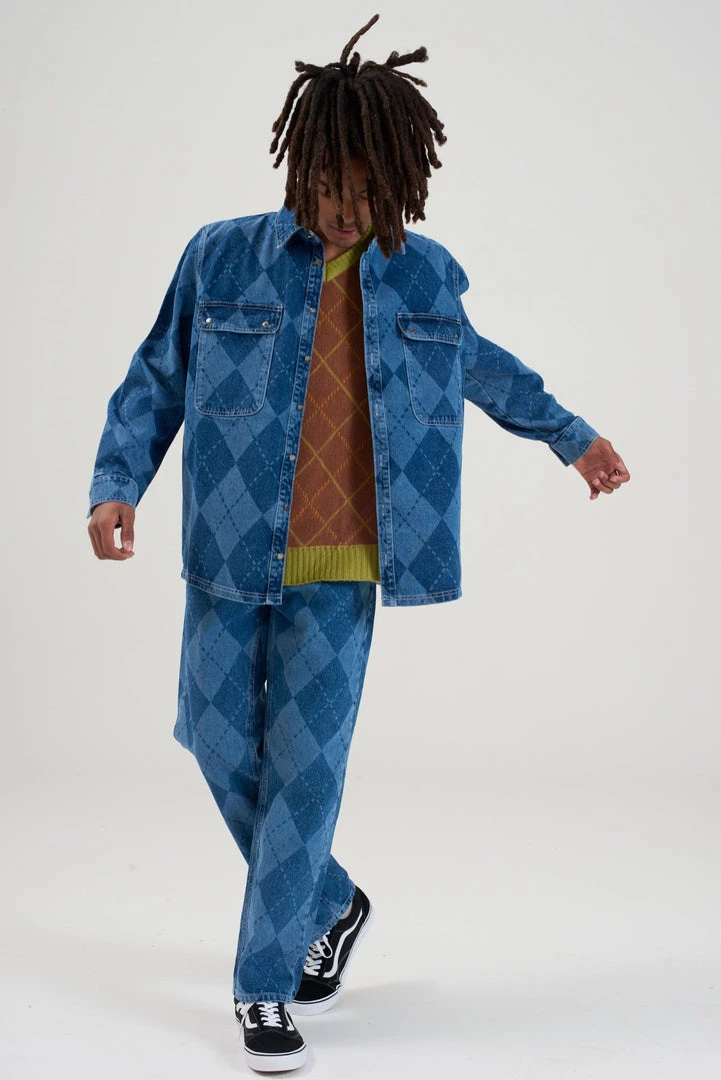 Ragged Jeans mens blue argyle denim shirt.