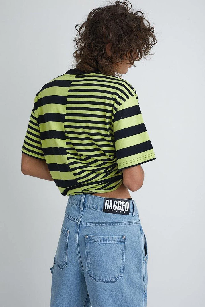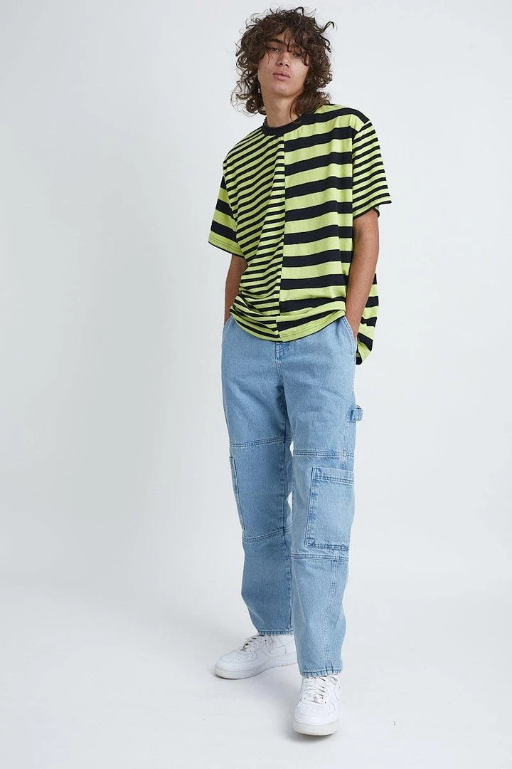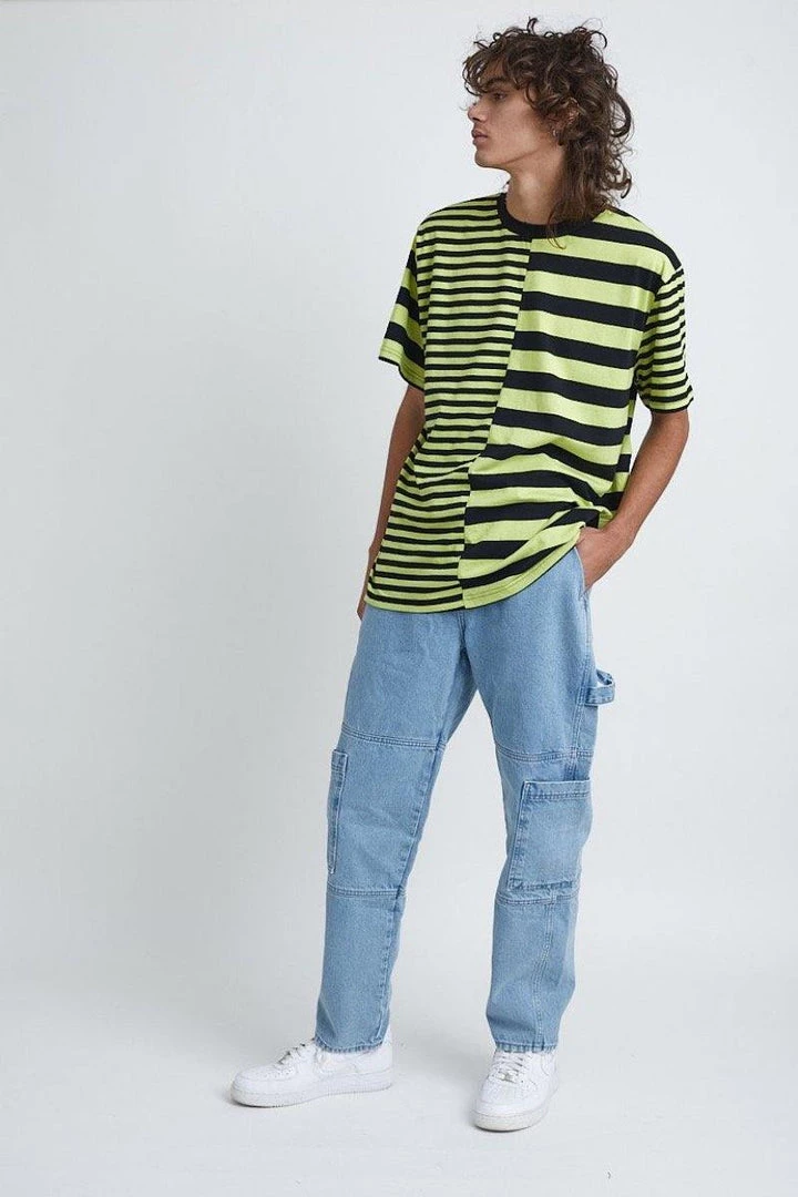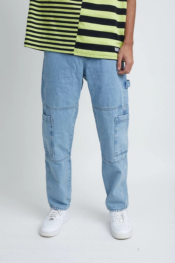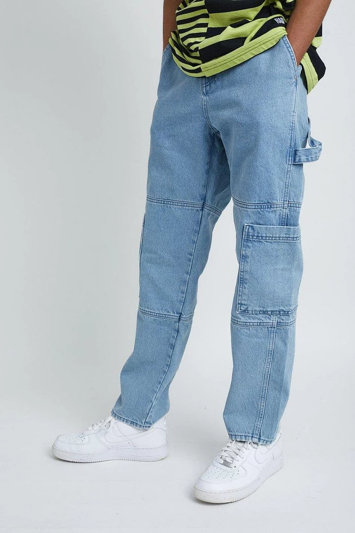 Men’s Light Blue straight leg combat jeans with paneling and combat pockets.
