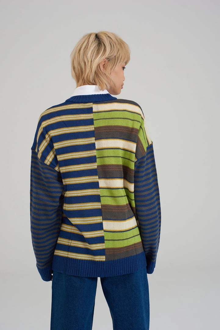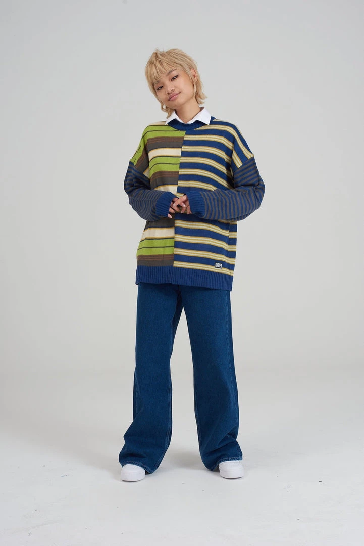 Ragged Jeans unisex mixed stripe panelled long sleeve knitted jumper.