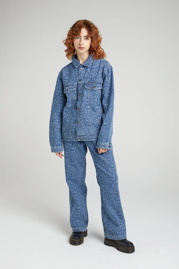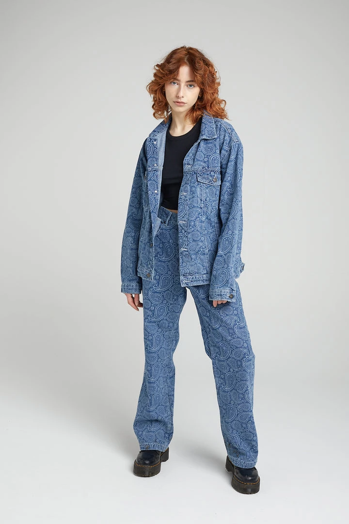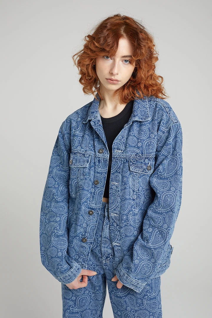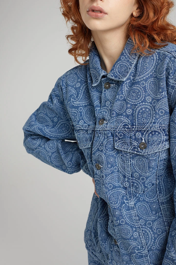 Ragged Jeans blue denim jacket with paisley printed design in white and “RAGGED Jeans” back tab.