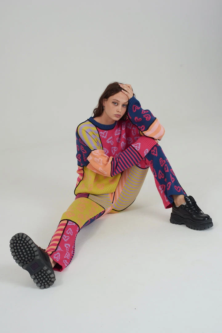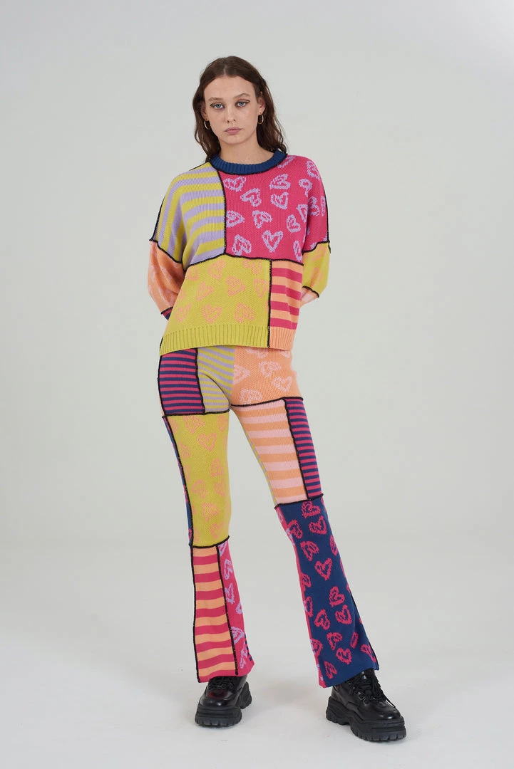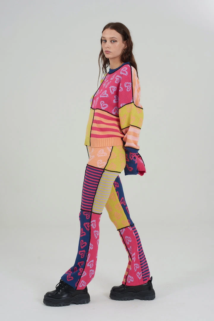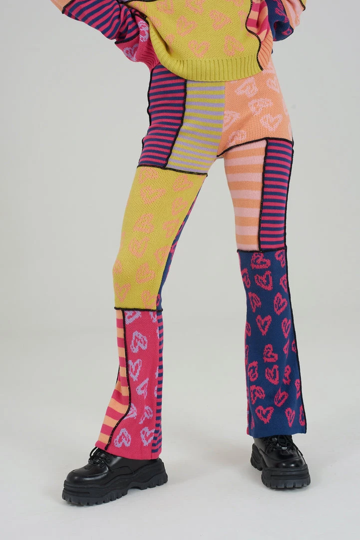 The Ragged Priest multicoloured patchwork knitted flares.