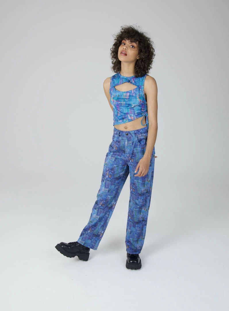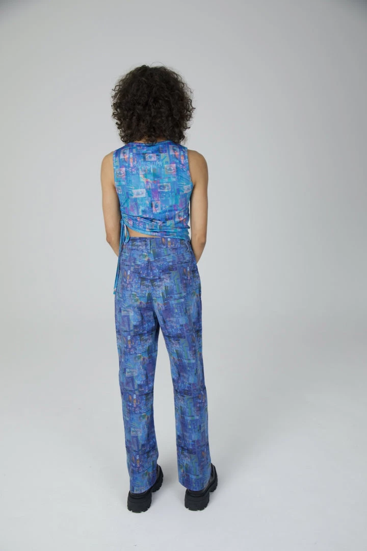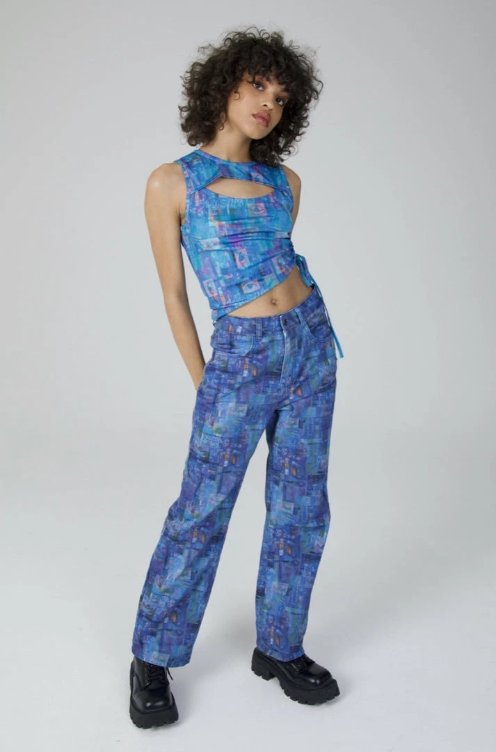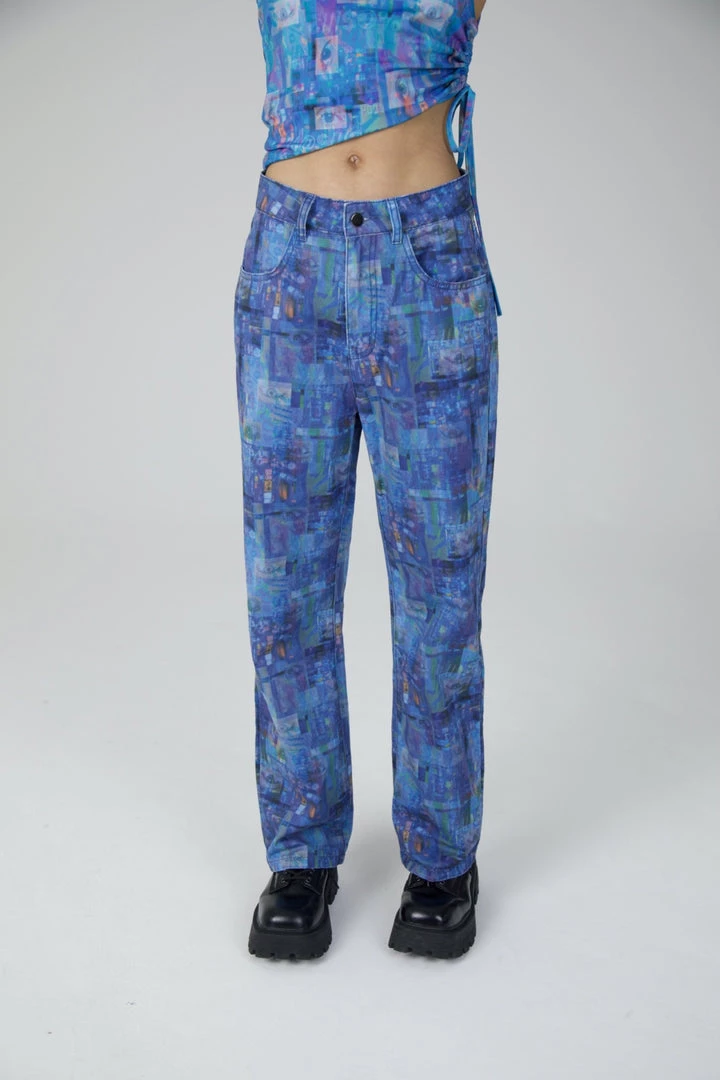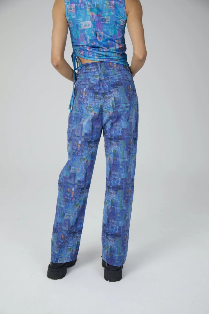 The Ragged Priest blue printed flares with eye graphic print.