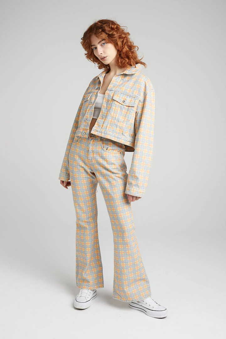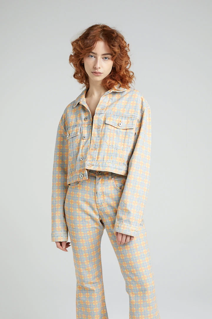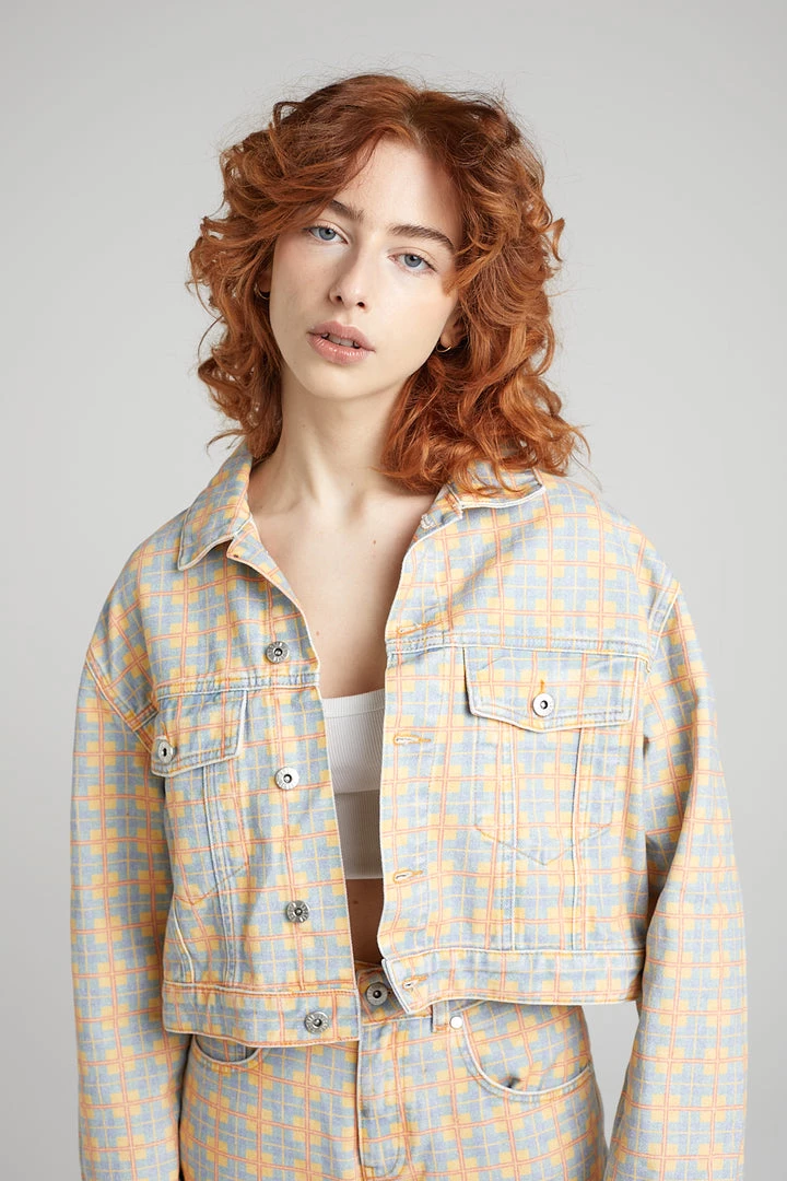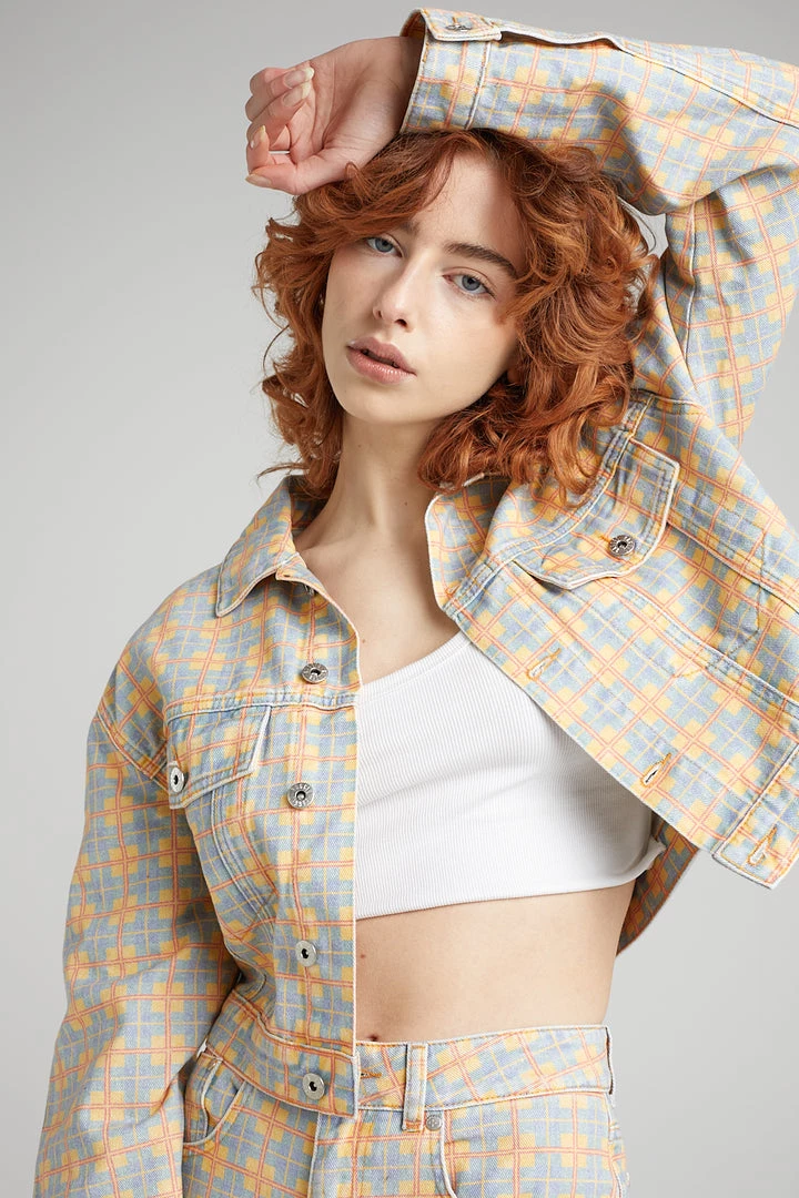 Ragged Jeans blue and yellow check denim jacket. Featuring our “RAGGED Jeans” back tab.