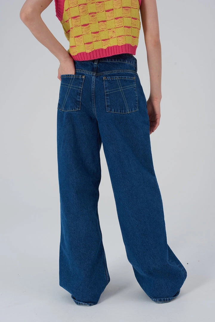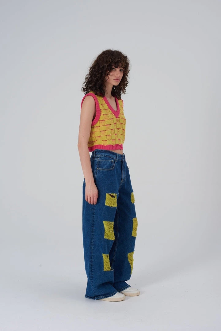 Ragged Jeans blue baggy skater style low-rise jeans with yellow fray patches.