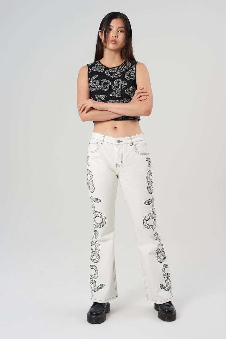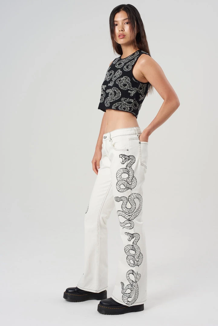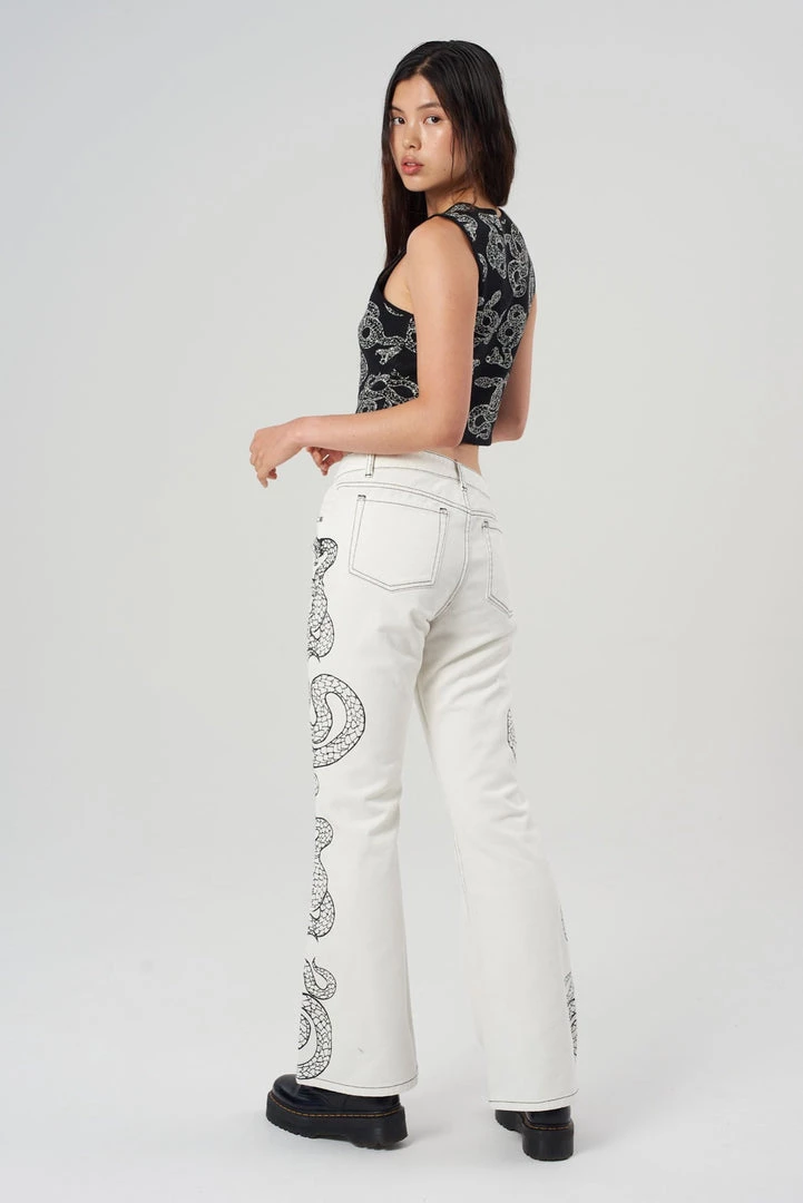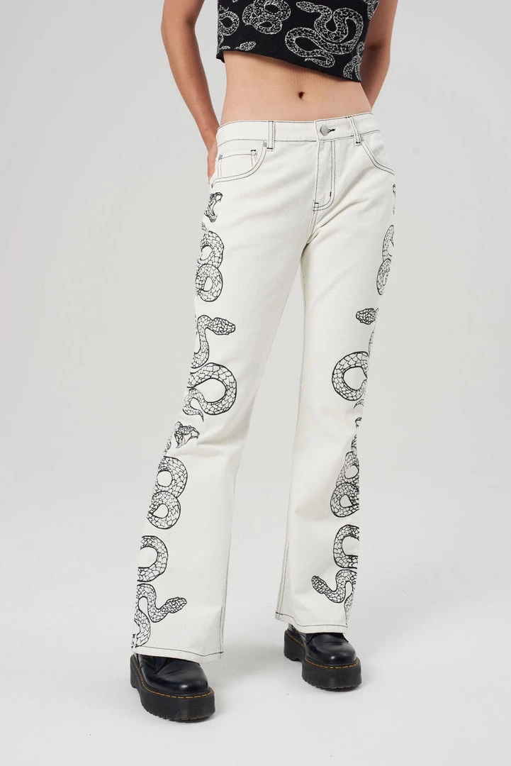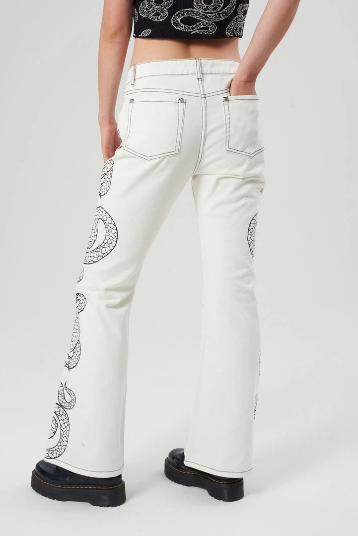 The Cobra Jeans are our ecru denim flared jeans with snake pattern detail.